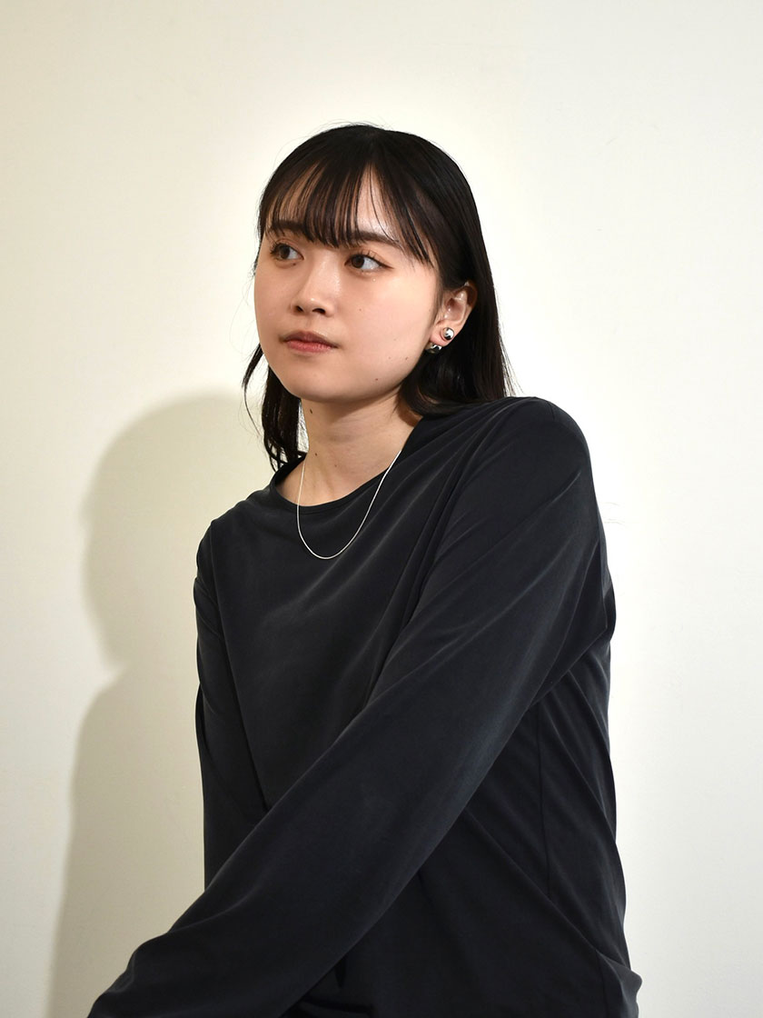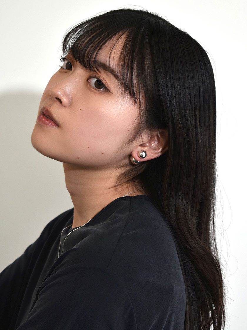 シルバーの艶やかな光沢が顔周りに知的な印象をプラスするピアスに、円柱とラウンドビーズが連なるミニマルかつタイムレスなロングネックレスを合わせた、シャープで洗練されたスタイリング。80cmのネックレスは2連にしてアレンジするのもおすすめ。スタイル全体をクラスアップしてくれます。