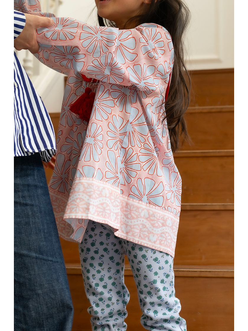 自身も母である「エスゼット ブロックプリント」のデザイナー・サラさんと、何度も話し合いを重ねてオーダーした、女の子が思わず瞳を輝かせるような美しい色彩と心躍るようなトロピカルプリントのチュニック。お尻が隠れるぐらいの着やすい着丈のヴィンテージドレス型をベースに「エスゼット ブロックプリント」ならではの生き生きとはじけそうなエネルギーをぎゅっと詰め込みました。小さいうちはワンピースとして、大きくなったらチュニックブラウスとして、何年もお気に入りを楽しめます。