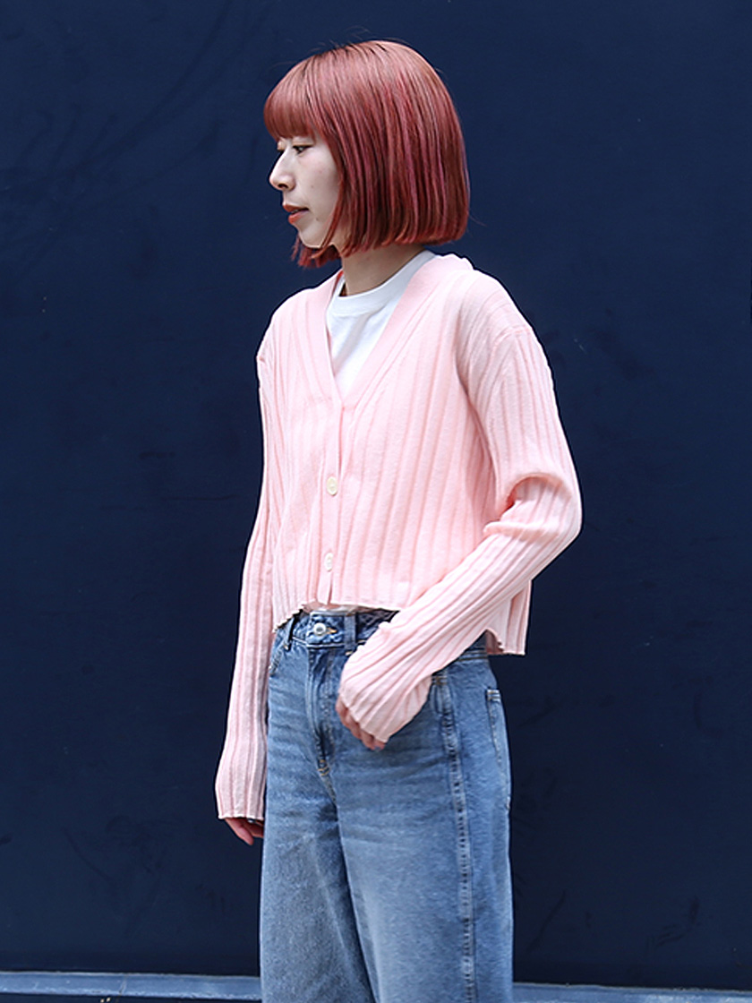 ピンクは柔らかく、ホワイトはよりクリーンな雰囲気に。デニムと合わせることで甘さが抑えられ、少しシャープな印象で着ていただけます。ショート丈なので自然と視線が上にまとまり、全体がすっきりとしたバランスに。袖はやや長めで、太めのワイドリブが縦のラインをつくるため、シルエットもきれいに整って見えます。