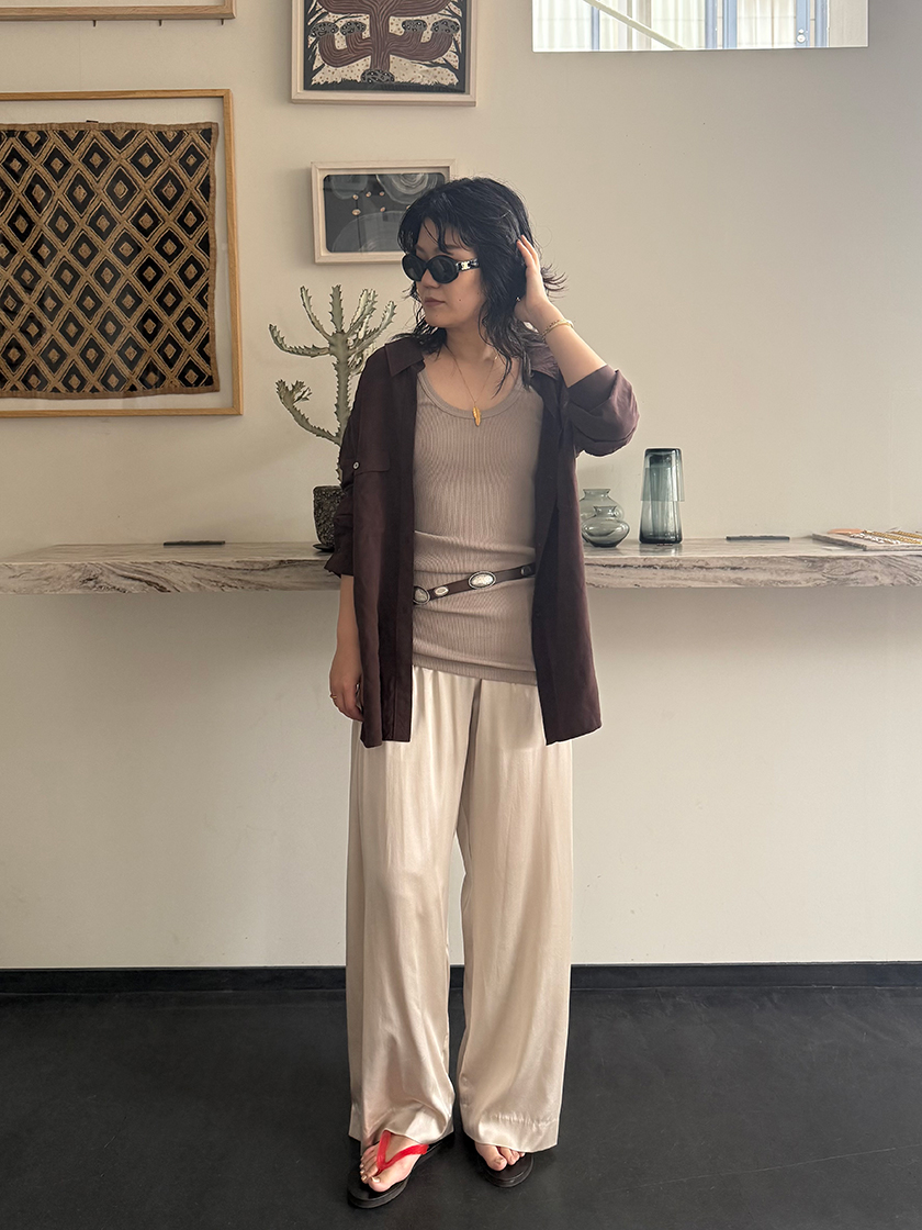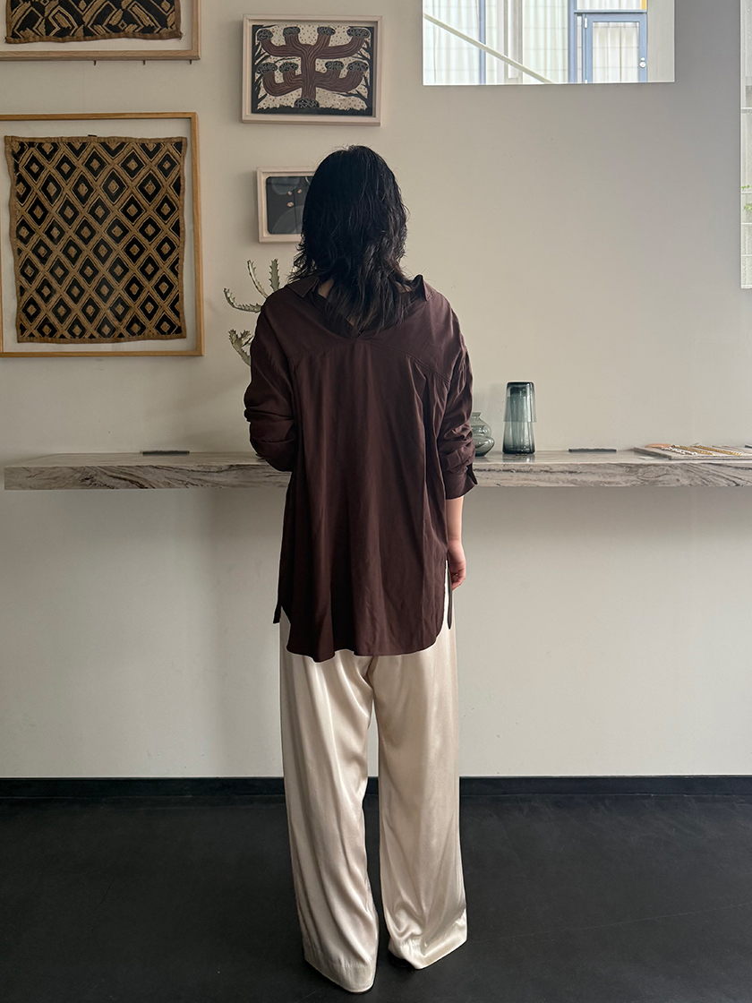 なめらかでとろみのあるシャツは、さっと羽織るだけでリラクシーなムードに。艶のあるシルクパンツと合わせれば、サマーリゾートを感じさせる上品なスタイリングが完成します。