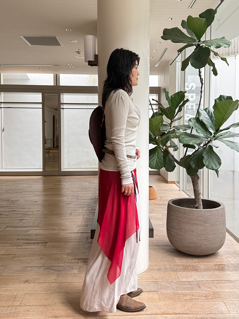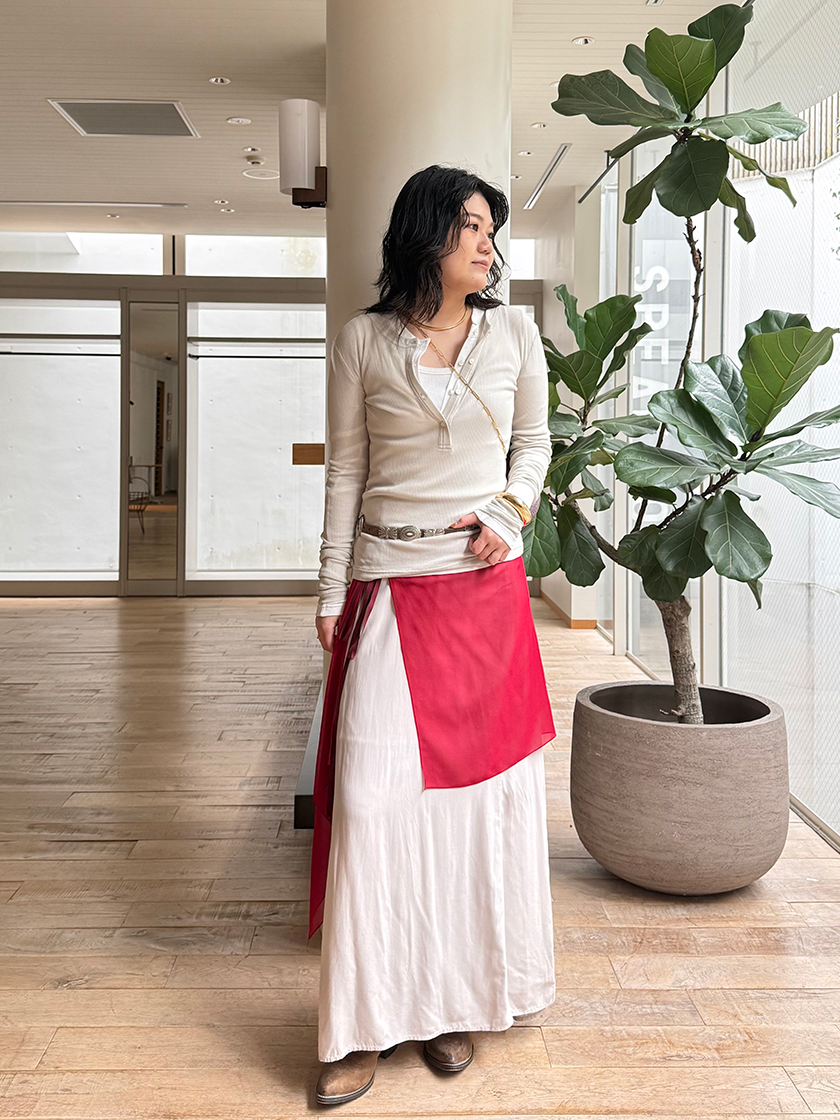 トップスには、さらりとしたマットな質感と程よいシアー感が魅力のヘンリーリブプルオーバーをレイヤード。ベージュトーンのベーシックな装いには、今年らしく赤を差し色に。落ち感のあるフレアスカートが、甘さを抑えた大人のバランスに仕上げてくれます。