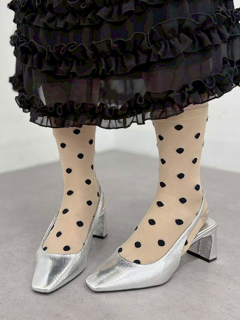 ポルカドットを散りばめた、さりげなくフェミニンな一足。甘くなりすぎないから、ローファーやフラットシューズ合わせが好相性。シンプルな装いの日ほど、足元のニュアンスが効果あり!