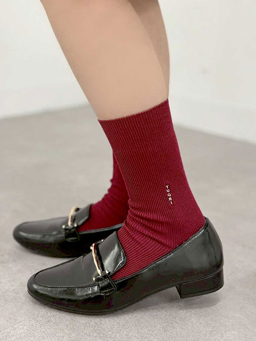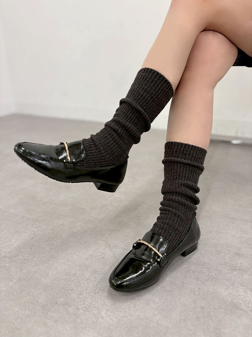 黒ローファーに合わせた、「ユクリ」の定番「silky」と「crispy warm」。きれいめにまとめたい日は、なめらかな質感の「silky」。少し力を抜きたい日は、くしゅっと履ける「crispy warm」がちょうどいい。気分や装いで選べる懐の深さも、このブランドらしさです。