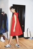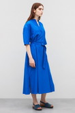 このワンピースの魅力は動いた時にこそ。片側をベルトで絞ったアシンメトリーなドレープが、歩くたび違った表情を見せてくれます。