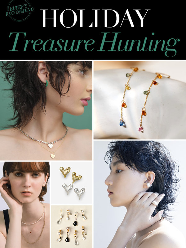 ホリデージュエリーの中でも、バイヤーのいち推しはハートモチーフ。「ノウハウ」や「オー」「ローラロンバルディ」など、ハートにフォーカスしたブランドも数多く登場し大注目。ゴールドやカラーストーンといったリュクスな素材使いや、フォルムにこだわったジュエリーは、ぜひ大人の女性にこそトライしてほしい。