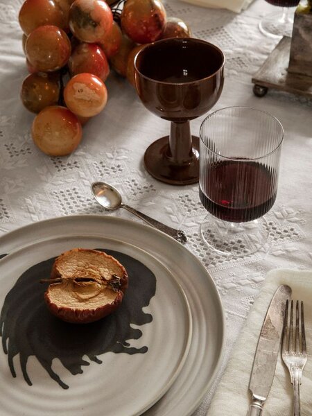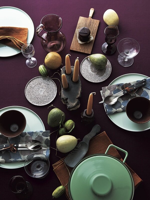 色彩のトレンドは、ダスティから深みのあるニュアンスカラーへ移行中。ブリックレッドとボルドーを中心にモーブやハニーデュー、ジェイドグリーンを重ねた絵画的なテーブルが今の気分です。中間色のフルーツや野菜でデコレートすると、よりフーディーらしいスタイルに。