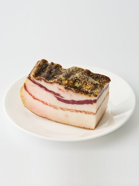 仏屈指のブランド豚、ビゴール豚のバラ肉を塩漬けにし、成熟させて作る生ハムは水分が抜け、うま味が凝縮。熟成の香りと脂の甘さでそのままでも、調味料にも使える優秀食材です。