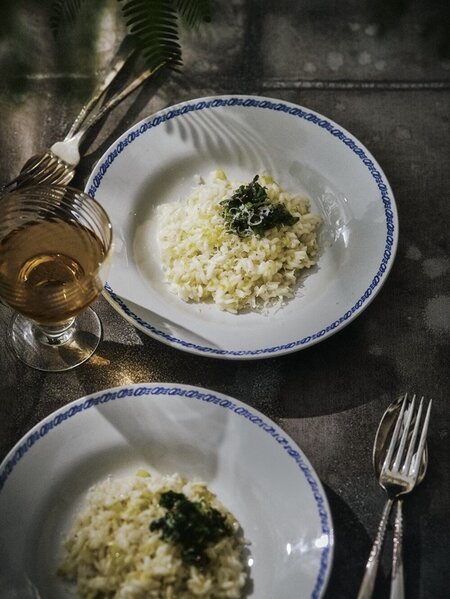残ったセロリの葉をスープにし、米を炒める際に活用することで、うま味が存分に引きだされ、だしいらずでリゾットが出来る。