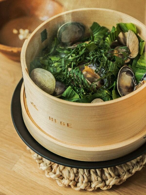 「HEGE」の熱伝導率の高いアルミの器に、ミニサイズの和せいろを組み合わせて、あっという間におかずが完成!