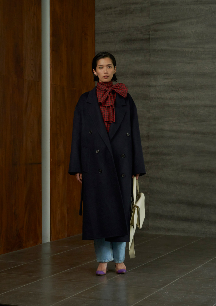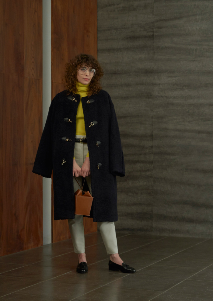 「厳選したモンゴルのベビーキャメル原料を使用し、和歌山で編み立てたボアコートにもご注目を。キャメル色は天然の色をそのまま使用しています。寒暖差のある地域で生息するキャメルは保温性にすぐれ、中でもベビーキャメルの柔らかさと肌触りは格別。見た目よりも非常に軽く、表面の手触りは柔らかなフリースタッチで、ウォーム感をより感じられる仕上がりです」。