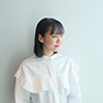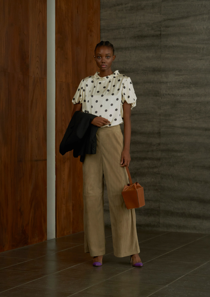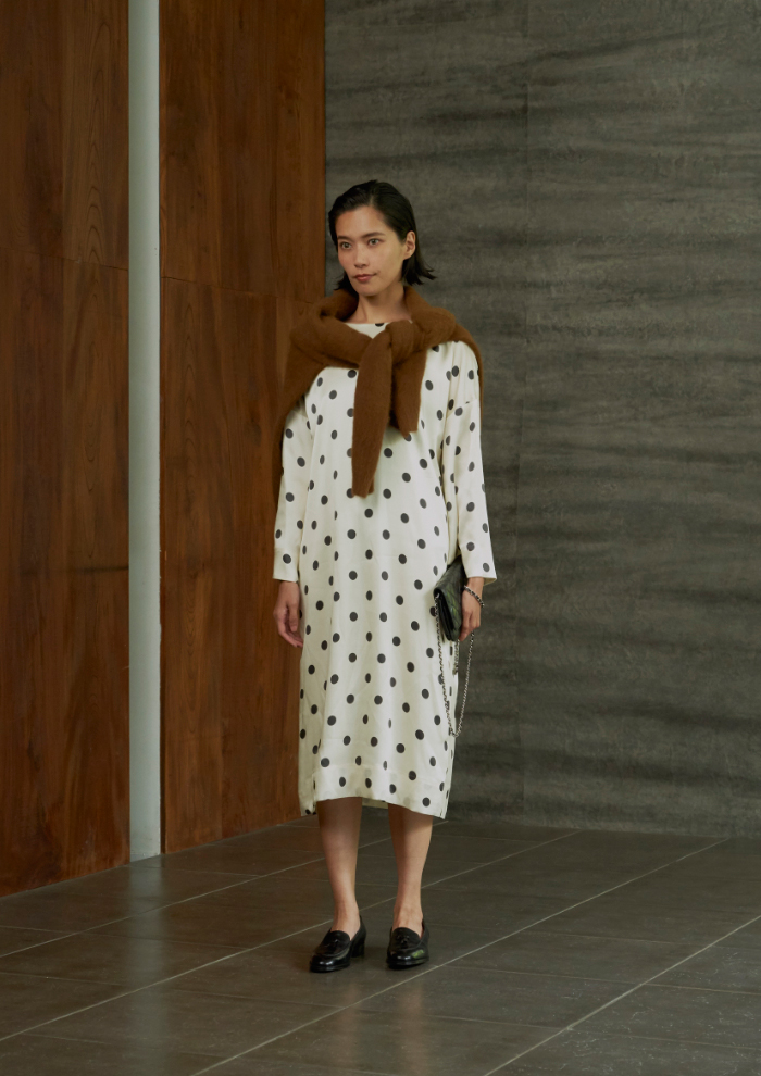 「こちらは、ほどよいバランスでドットを配置した、20匁の厚みがあるシルクサテン素材のブラウス。プリント生地の有名な産地である京都の老舗生地メーカーにて別注しています。上品な光沢となめらかな肌触りは絹100%ならでは。ブラウスはきれい目にもカジュアルコーデにも活用でき、ジャケットのインナーとしてもおすすめです」。