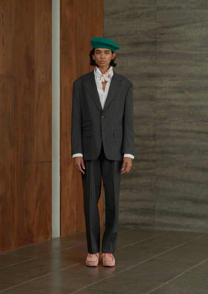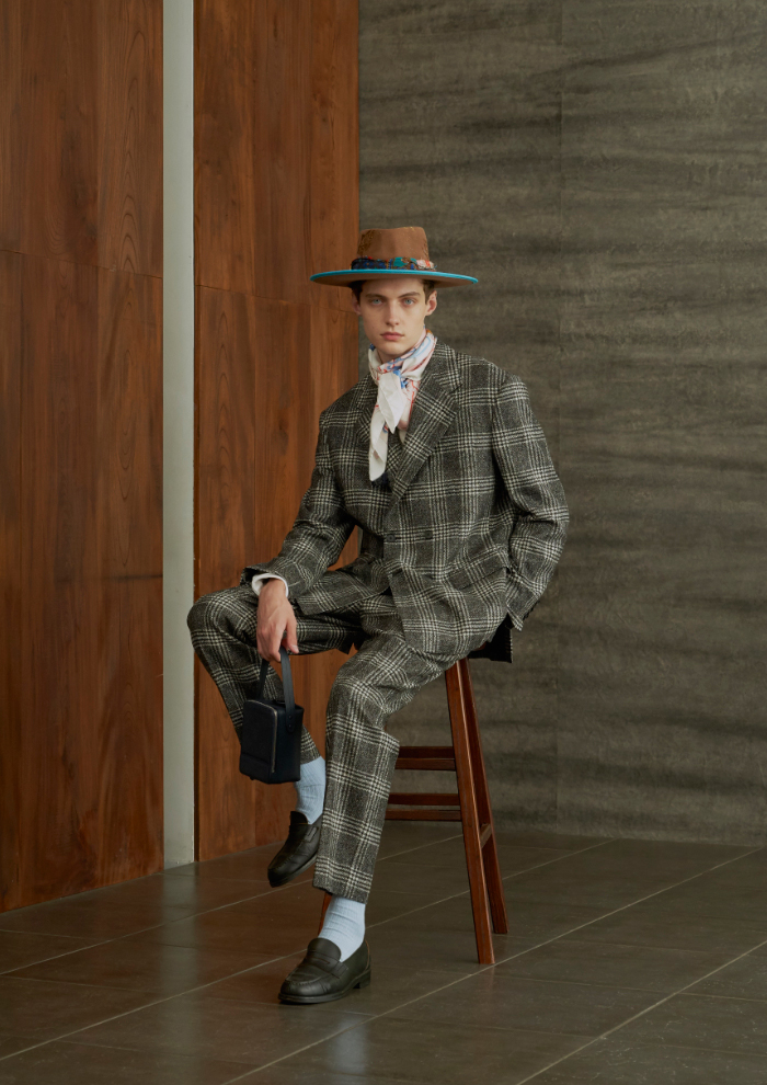 「最高級生地をつくり出す地域として有名なイタリアのビエラ地方で、100年以上の歴史を誇る生地メーカー「タリア ディ デルフィノ」の生地を使用したジャケットとパンツのセットアップ。コレクションより“ソフトフランネル”シリーズをセレクトしており、柔らかく、シワになりにくく、耐久性に優れるよう特別な織り方をしています」。