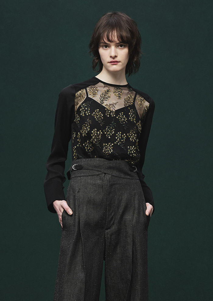 「これまでのコレクションでは具体的なパーマネントアイテムのデザインはあまり行いませんでしたが、今回はMA-1を題材にしてみたり、古着からインスピレーションを得た刺しゅう、色使いなどを取り入れたりと、今までにない切り口で構成しました。コットンのレースやリンクス編みのカットソー、ビンテージライクなニットといった素材のチョイスも、テイストに合わせたセレクトに。「ロキト」のエレガンスを残しながらも、そうしたアプローチに挑戦したコレクションです」。