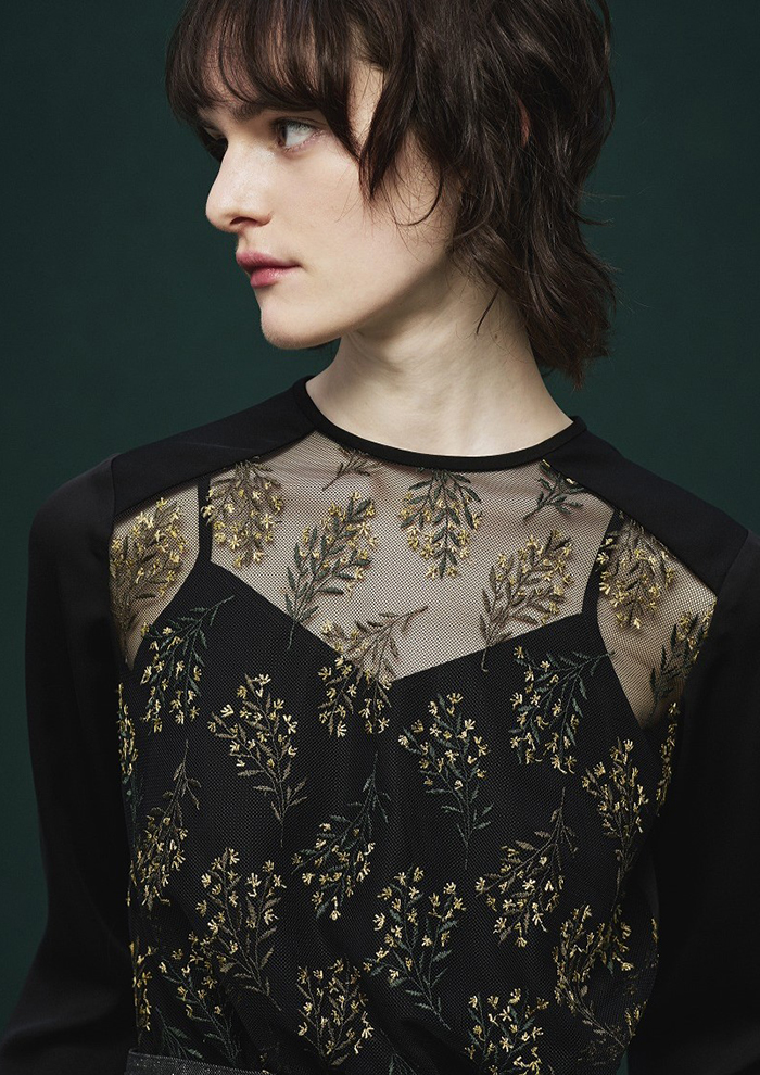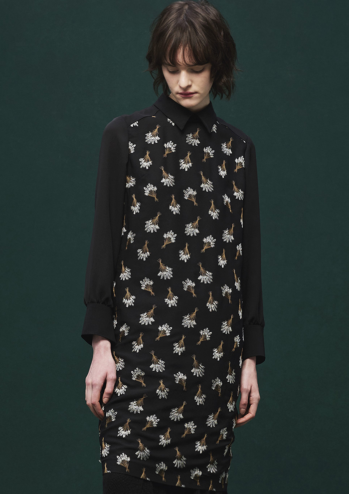 「こちらは、コード刺しゅうをあしらったドレス。肩の刺しゅうがポイントになっており、深いVネックにすることでシャープな印象に仕上げています。ブラウスやニットのレイヤードスタイルを楽しんで」。
