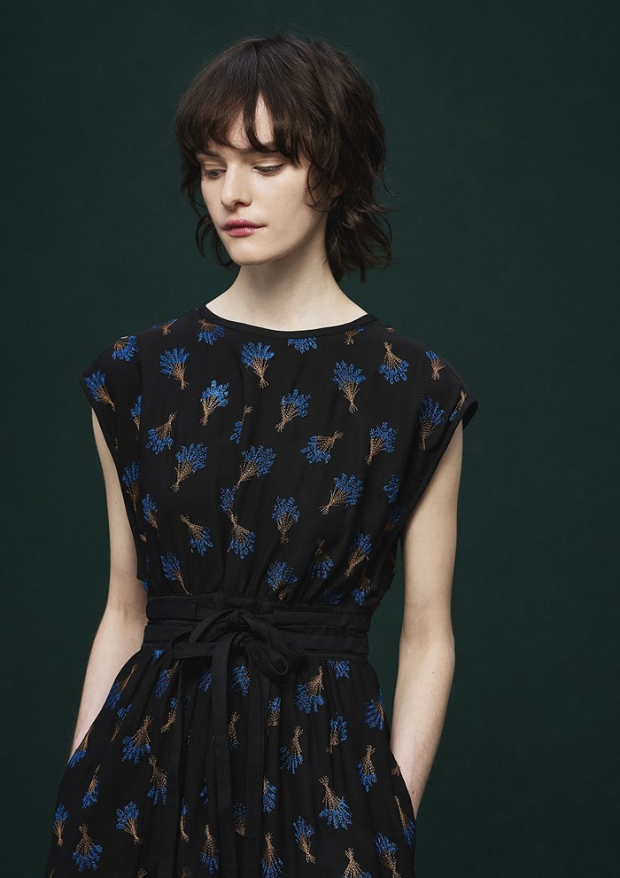 「こちらもビンテージ資料をもとにデザインしたボタニカル柄のスポット刺しゅうノースリーブドレス。しっかりとした素材感はデイリーにも着やすく、ルックのようなレイヤードスタイルもおすすめです」。