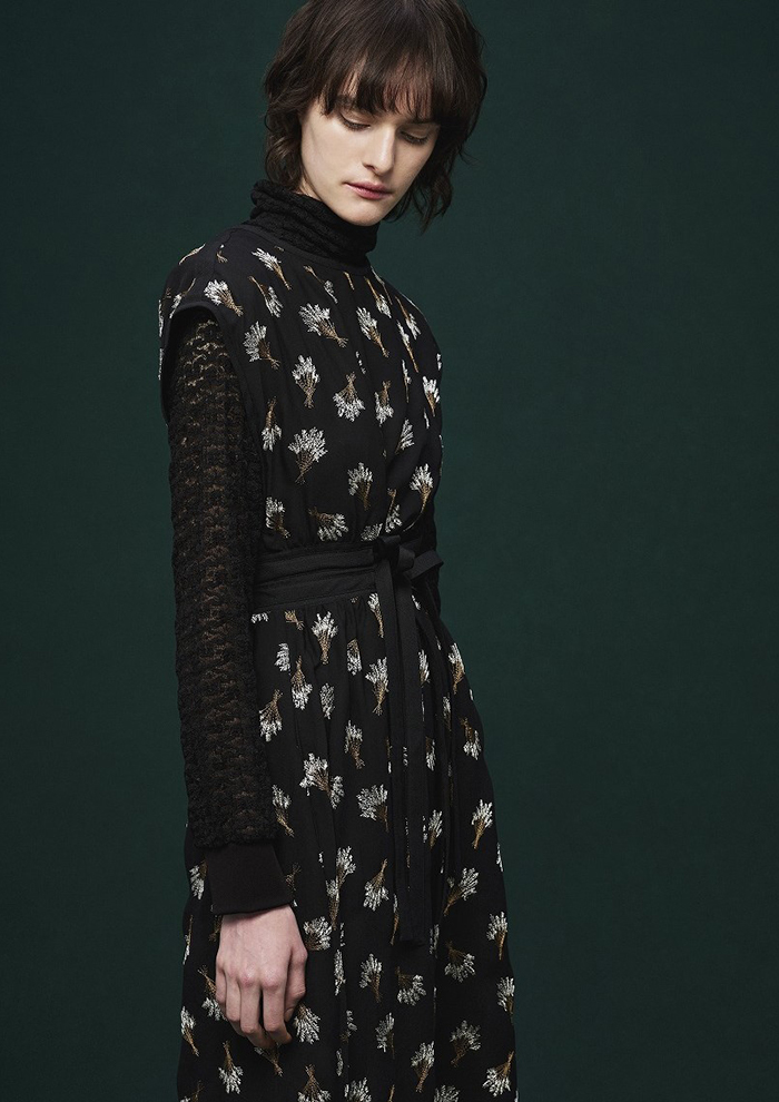 「デザイナーが今季のために収集したビンテージ資料をもとにデザインしたボタニカル柄。クラシックなムードのひざ下丈が新鮮で、長袖ドレスはロングスパンで活躍します」。
