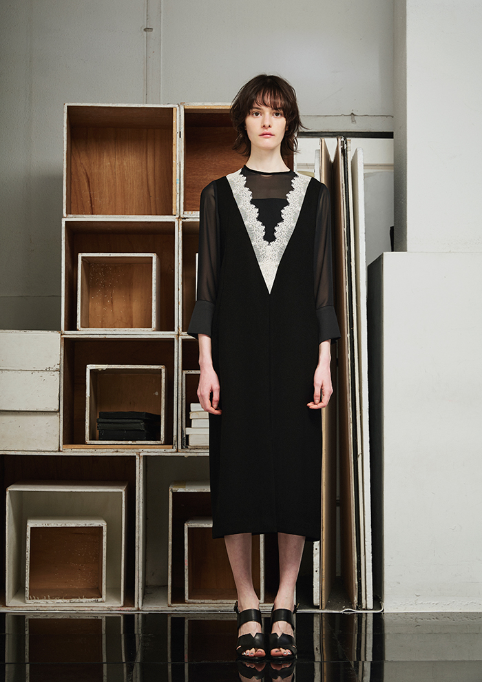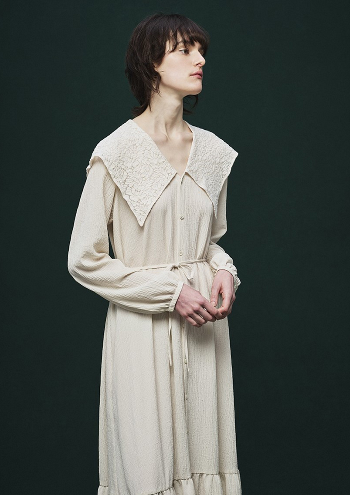 「表情のある楊柳の素材をベースに、ビンテージライクなコットンレースの襟をあしらったワンピースドレス。たっぷりとした分量感とレースの繊細さが贅沢な一着です」。