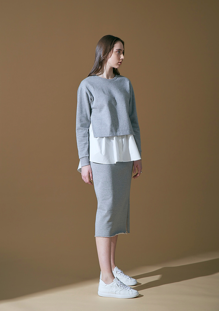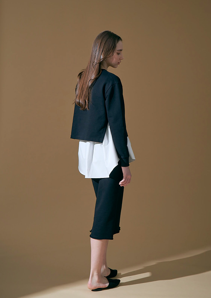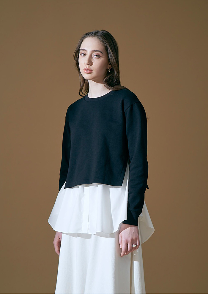 「続いては、新作のシャツコンビプルオーバー。シャツコンビパーカーと同シリーズのアイテムで、シャツとレイヤードしたデザインはそのままに、シンプルなショートプルオーバーとコンビになった、より着まわしやすいアイテムです。フードが苦手という方にもおすすめ。スウェットとシャツが分かれているので着心地がよく、ボトムや身長に合わせて長さの調節が可能です。高めのサイドスリットからのぞくヘムラインもポイント」。