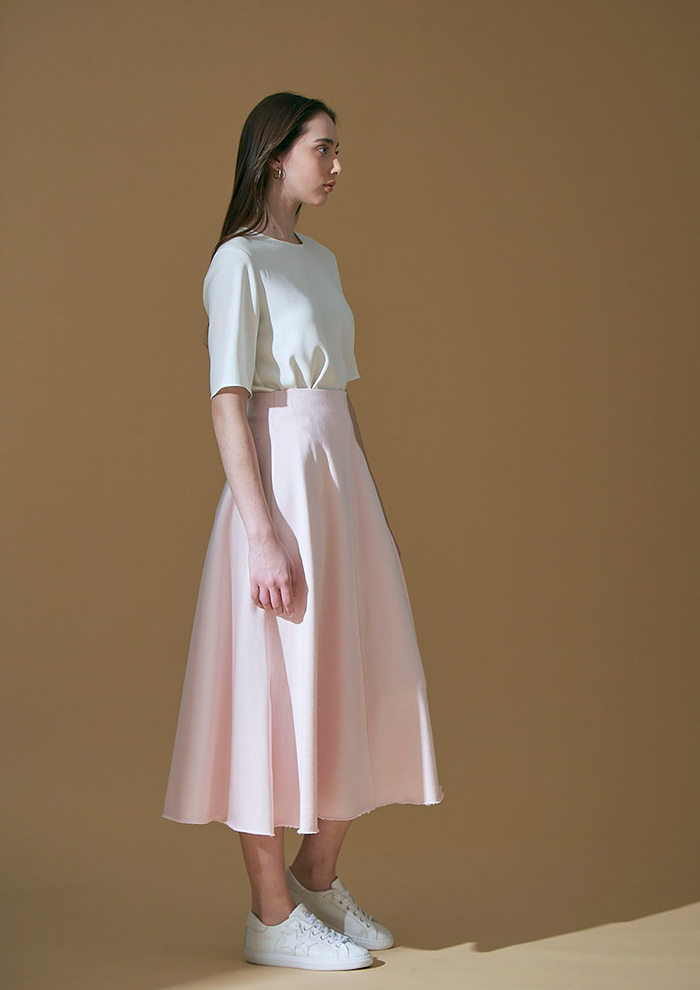 「デビューから展開しているフレアスカートは、分量感たっぷりの女性らしい雰囲気と、すっきりとしたウエストまわりが特徴。サイドスリットの軽やかさも◎」。