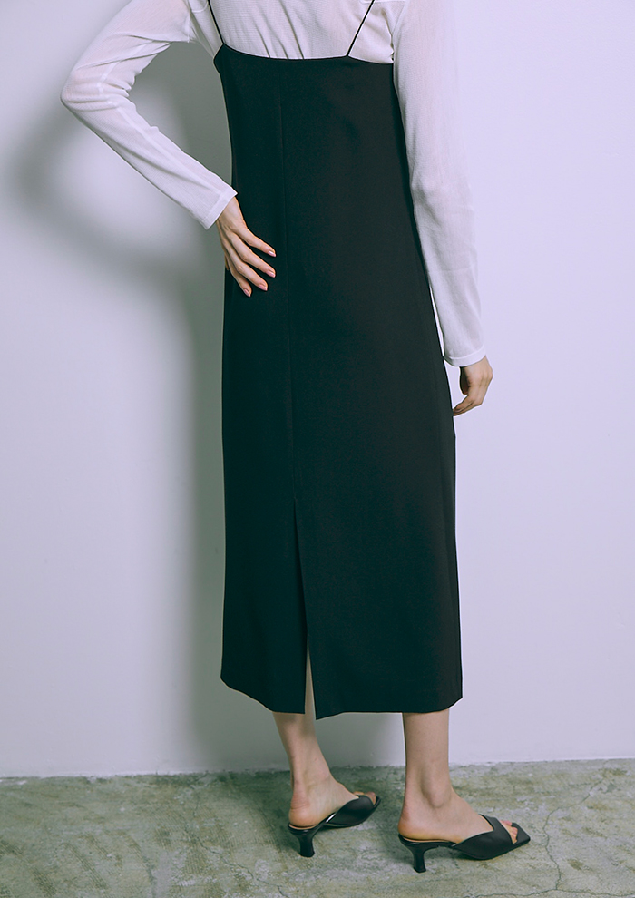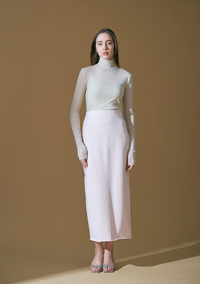 「3種類ある同素材のボトムは、セットアップ用に持っておくと便利です。一番人気のタイトスカートは、シンプルで着まわし力抜群のアイテム。すっきりとしたシルエットで、身長を選ばないレングスも人気の理由です。サイドファスナーはお好みでスリットに」。