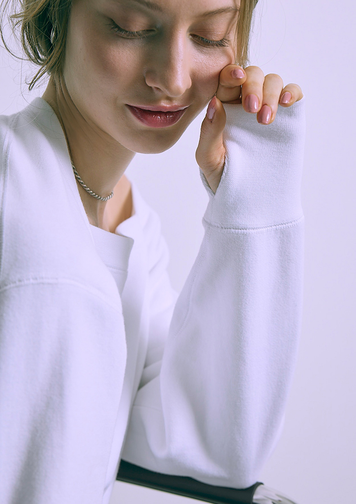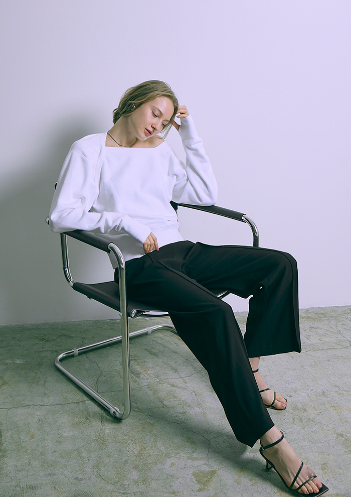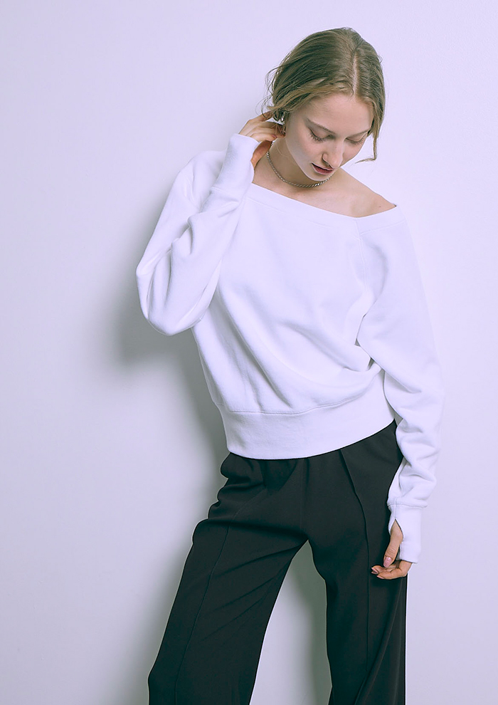 「続いては、新作の吊り裏毛トップスです。吊り裏毛は、ビンテージでよく見られる素材で、とても希少な旧式の吊り下げ型編み機で編んでいます。1時間に1メートルしか編むことができないうえに、機械を調整する職人も減っているため、生産数に限りがあります。ゆっくりていねいに糸を編むことによって、糸や生地への負担が少なく、独特のテンションに。普通の裏毛よりもループが長く、ソフトな肌ざわり。空気と一緒に編んでいるかのような絶妙なボリューム感は、やみつきになること間違いなしです。そんな吊り裏毛を使用したアシメトリーデザインのワンショルプルオーバーは、襟元のカッティングで女性らしい雰囲気に仕上げました」。