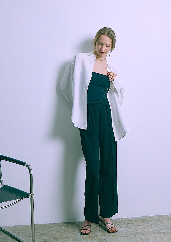 「今年から定番アイテムに仲間入りした、「カルナ」のジョーゼットスラックスパンツ。ウエストはゴム仕様でリラックス感がありながら、センターシームによってきれい見えする、大人のイージーパンツです。ハイウエストのすっきりとしたシルエットは、スタイルアップ効果も抜群! ドレープ感のあるエアリーなジョーゼット素材のため、スタイリングも自在です。Tシャツやスウェットなどと合わせてもカジュアルになり過ぎず、上品で美しいスタイルに仕上がります。同素材でトップスも展開しており、セットアップも◎」。