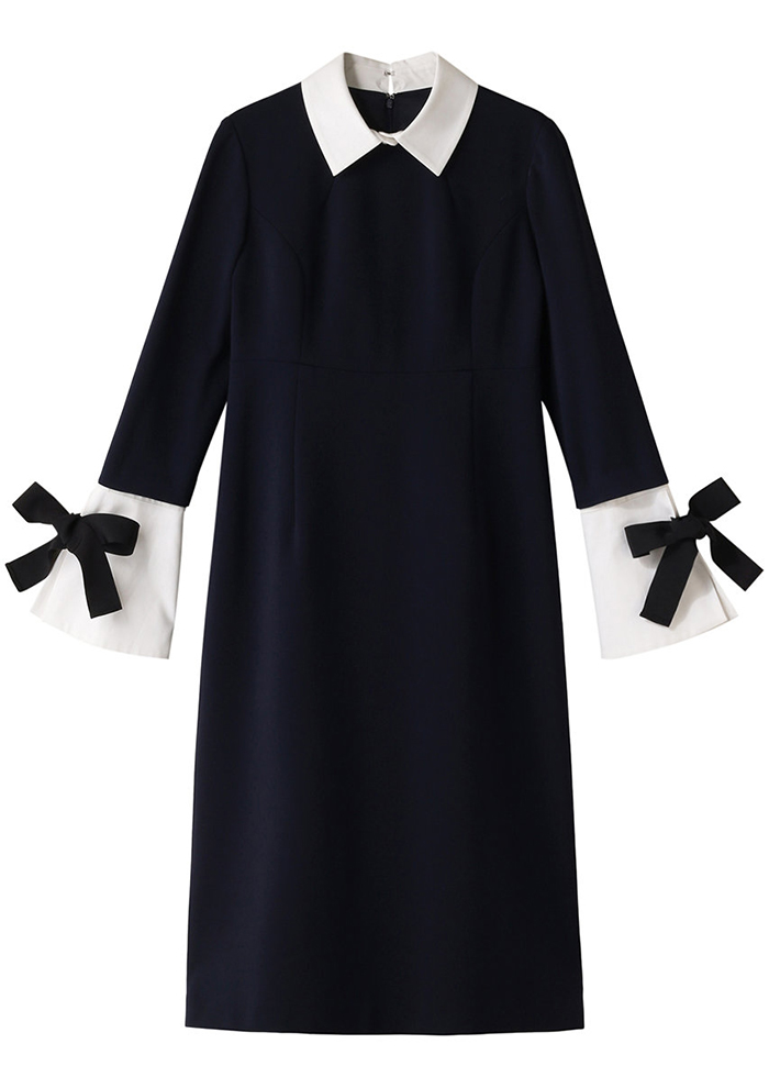 「上品なロイヤルネイビーをベースに、白襟と白カフをアクセントにしたドレス。適度な厚みとストレッチ性のあるポンチ素材で仕立てており、すっきりとしたシルエットは体のラインを拾いにくいです。袖元のリボンは取り外し可能。外してシンプルに着れば学校行事などのオケージョンシーンにも最適です。他にはないやや長めの白カフ部分が、清楚感とモダニティを兼ね備えて」。