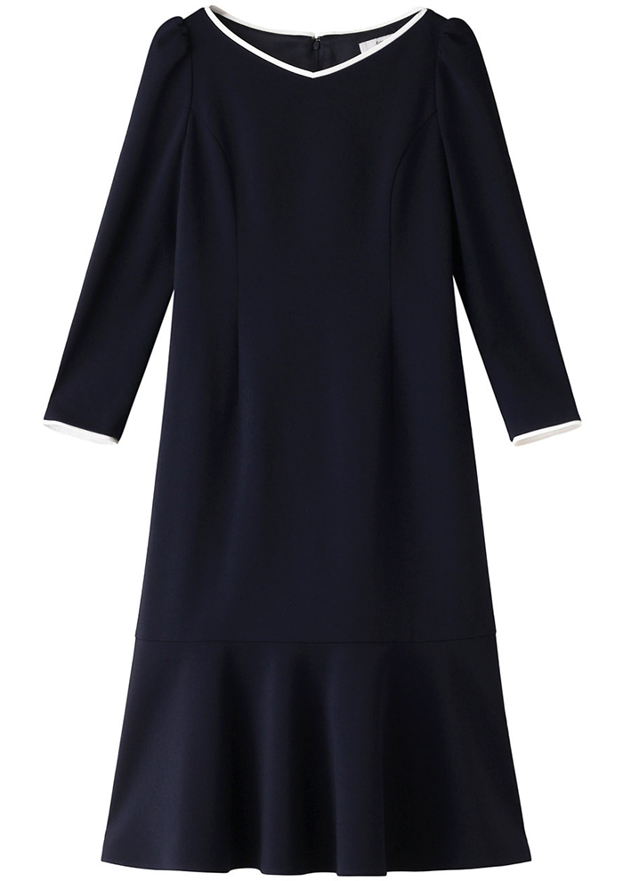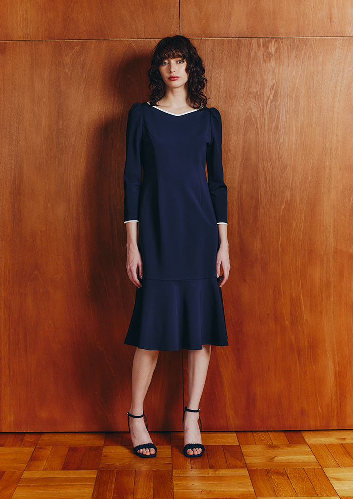 「ロイヤルネイビーのポンチ素材で仕立てた、ソフトマーメイドシルエットのドレス。体の気になるラインを隠す適度な肉感の素材と、立体的なパターン、品の良いカッティングによって、美しいスタイルを演出します。デコルテラインと袖元の白のパイピングがクリーンなアクセント。学校行事からブライダルのお呼ばれ、ビジネスまで、どんなシーンでもきれいな佇まいを印象付けられる、360度パーフェクトな一着です」。