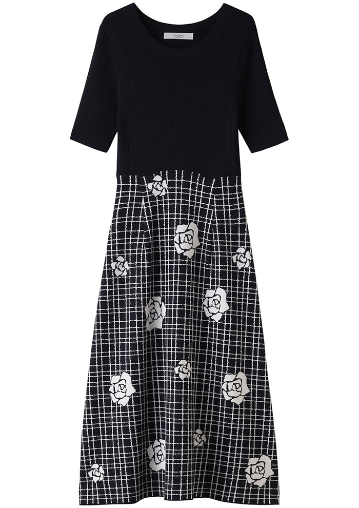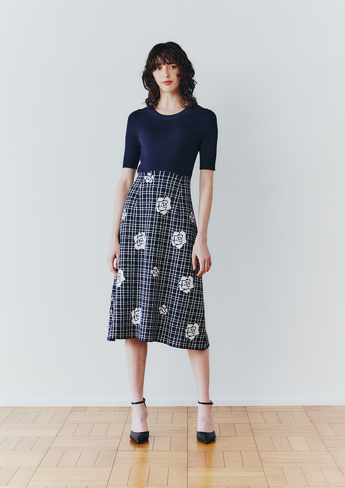 「エレガントなカメリア柄をジャカードで表現したニットドレス。上身頃はネイビー、下身頃をカメリア柄で切り替えており、華やかななかに清楚な雰囲気を感じさせます。切り替えの位置が高いためスタイルアップ効果も◎。肉厚のジャカードは体のラインを拾いにくく、上半身は華奢に、下半身はすっきりと見せます。同デザインのカーディガンとセットアップで着るとさらにクラス感のある着こなしに」。