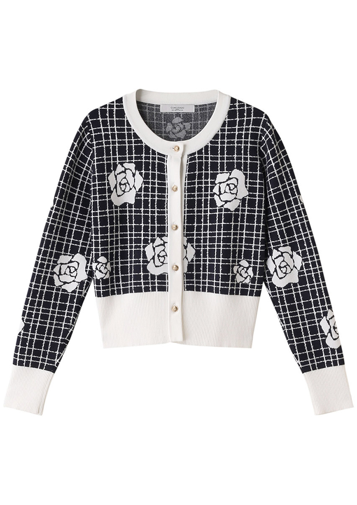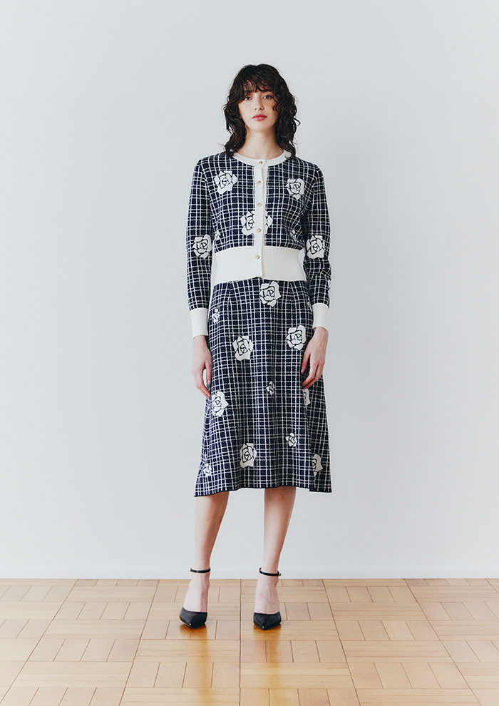 「チェックパターンにカメリアモチーフを組み合わせたジャカード織のニットカーディガン。ネイビーに白のパイピングが効いた、クリーンでエレガントなデザインです。しっかりとしたジャカードのおかげで、ニットジャケットのようなきちんと感も感じられます。同デザインのドレスとセットアップで着ると、よりスペシャルなおしゃれに。単品でシンプルなスカートやパンツルックに合わせて一点華やかにスタイリングするのも◎」。