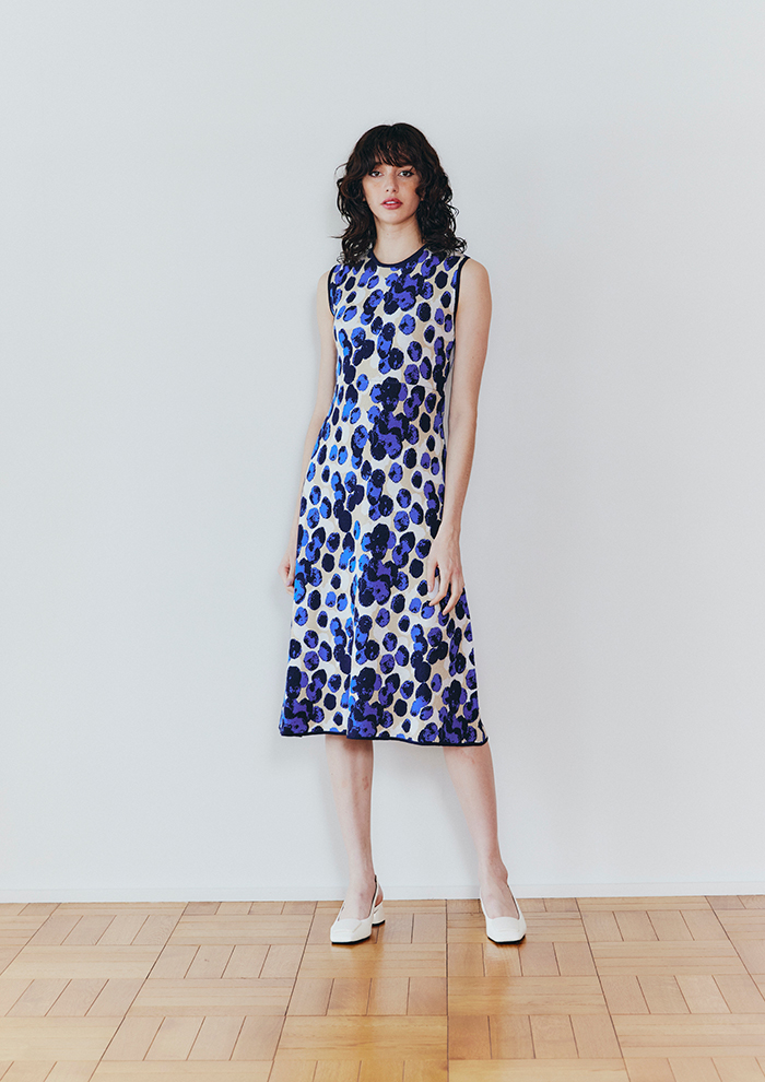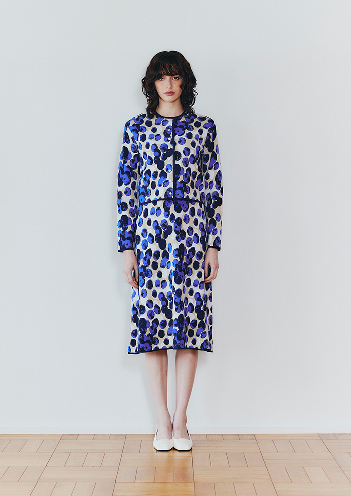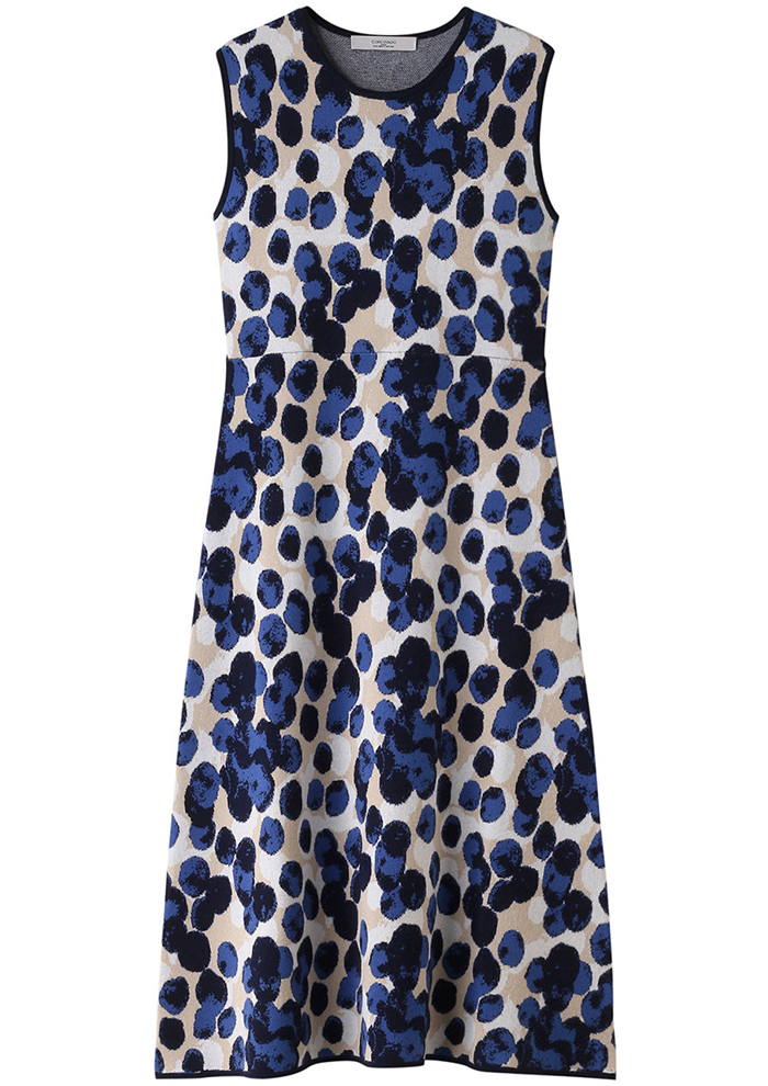 「モダンアートのようなドット柄をジャカードで表現したニットドレス。アイボリーとベージュをベースカラーに、ブルーベースの模様が爽やかに映えて。首元や肩、裾元のパイピングが引き締め役となって、色柄を引き立てます。しっかりとした目の詰まった編み目は体のラインを拾いにくく、すっきりとお召しいただけます。同デザインのカーディガンとセットアップできると、さらにファッショナブルな雰囲気に」。