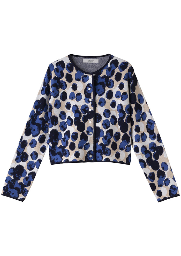 「モダンアートのようなドット柄をジャカードで表現したカーディガン。アイボリーとベージュのベースカラーにブルー系のドット柄が美しく映え、袖を通すだけでアーティな着こなしが叶います。引き締め色のパイピング、きれいに整列したスナップボタンもトレンド感たっぷり。カジュアル感がありながらもカッチリとした編み目のため、ジャケットライクに着用できます。同デザインのドレスとセットアップで着るのはもちろん、単品でもマンネリスタイルのカンフル剤に」。