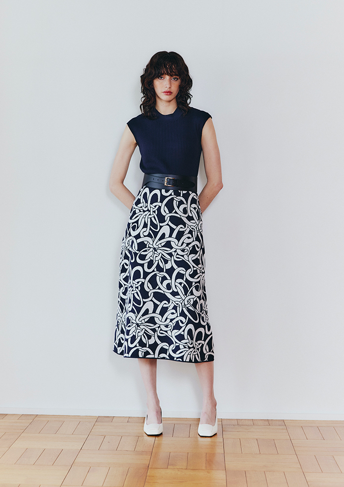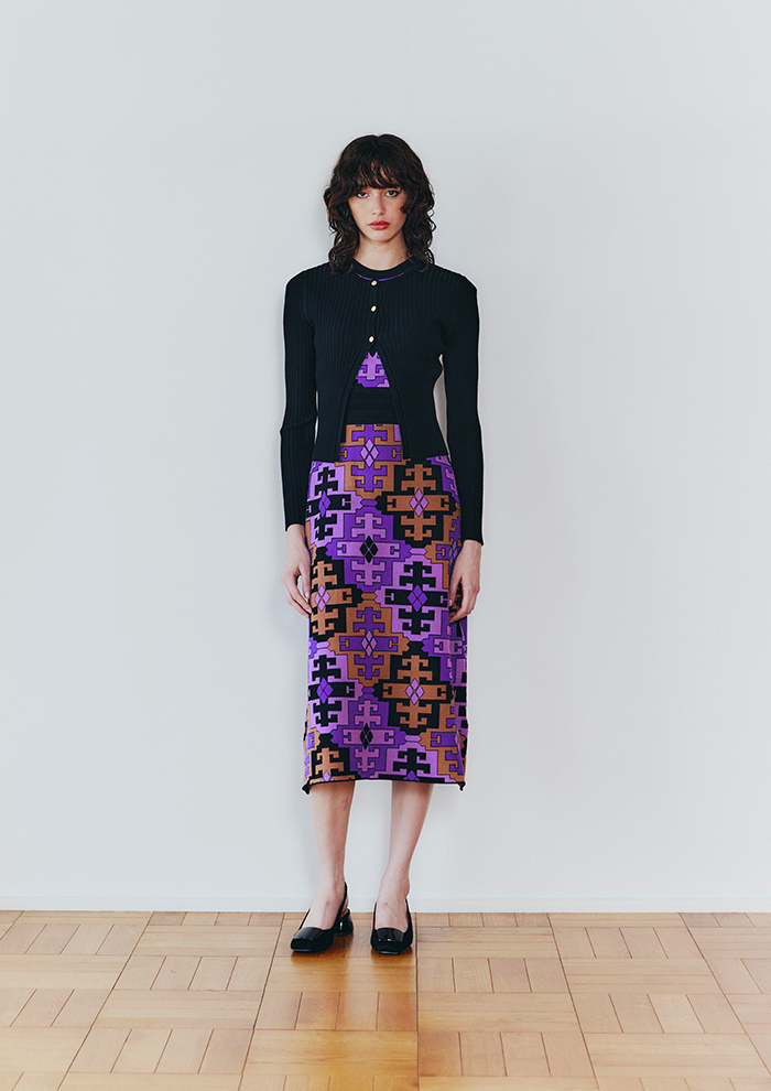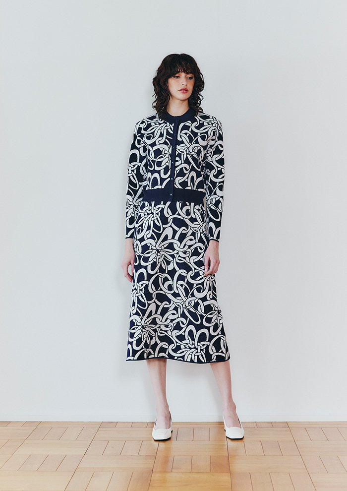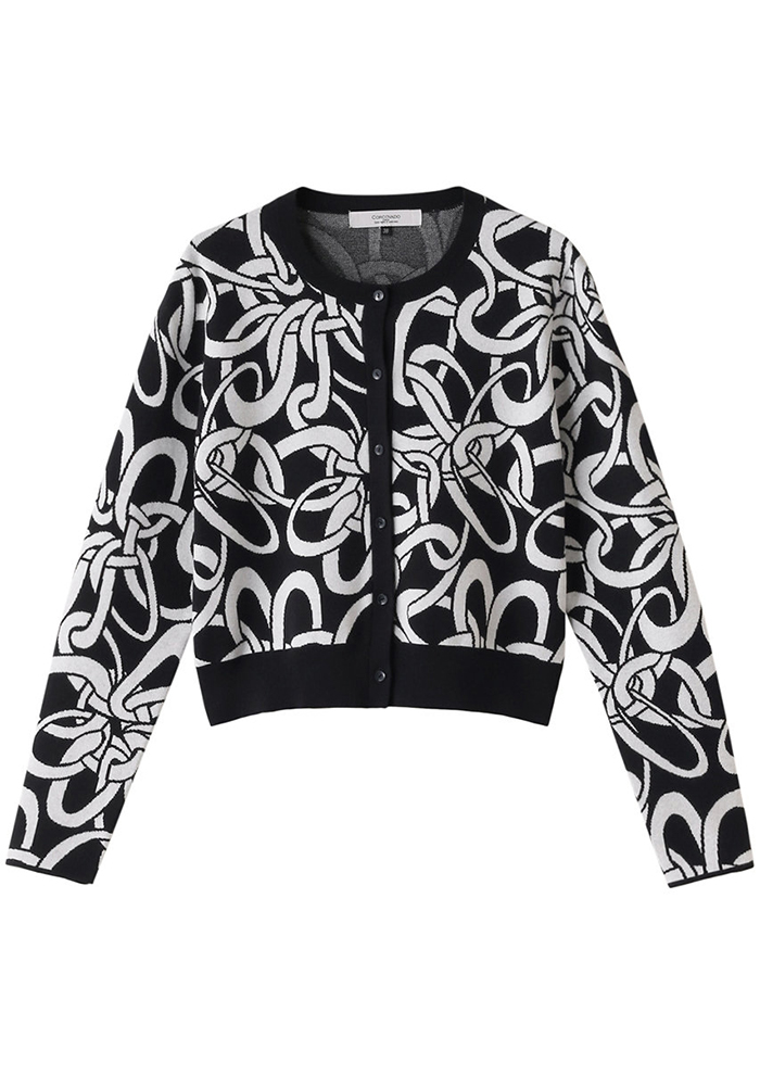 「モロッコのエキゾチックな柄からインスピレーションを得たハッサム柄のニットカーディガン。モノトーンの複雑な柄を緻密なジャカードで表現することで、ニットながらドレッシーにも着こなせるアイテムに。黒のパイピングがシャープに引き締め、きちんと感をアップ。同デザインのドレスとセットアップで着用するのはもちろん、手持ちのモノトーンコーデやデニムルックにプラスするのもおすすめです」。