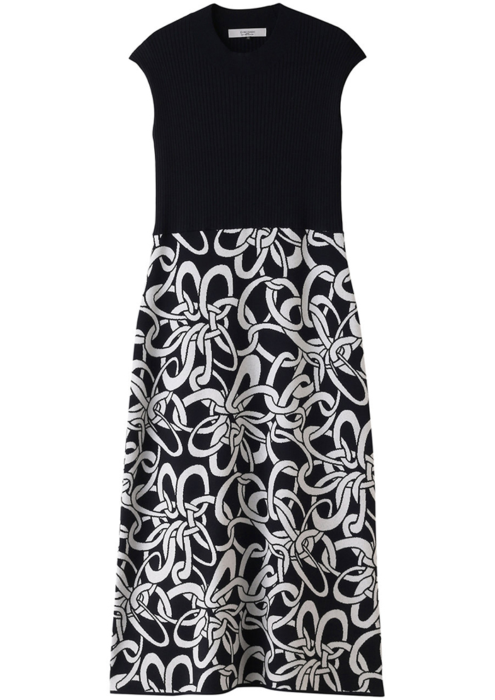 「モロッコのエキゾチックな柄からインスピレーションを得たハッサム柄のニットドレス。モノトーンの複雑な柄を緻密なジャカードで表現することで、ニットながらもドレッシーに着こなせるワンランク上の一着に仕上がりました。上身頃は黒、下身頃を柄で切り替えているためスタイルアップ効果が高く、すっきりとしたフレンチスリーブは二の腕を自然にカバー。同デザインのカーディガンとセットで着用すると、よりモダンなムードで着こなせます」。