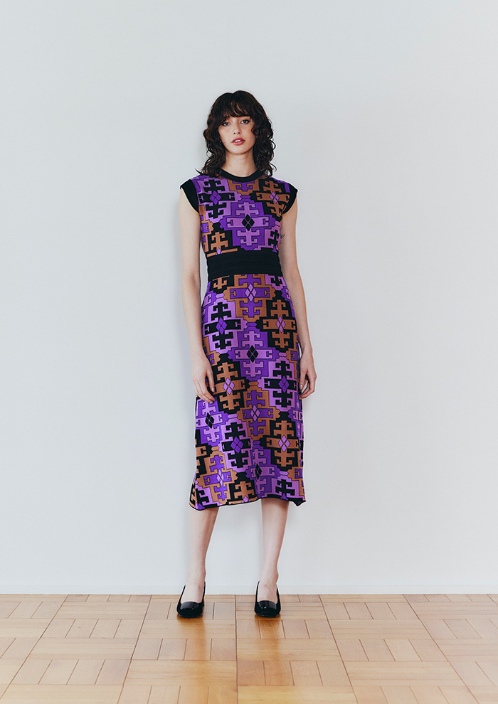 「2024年プレスプリングシーズンのテーマである“マラケシュ”の名をつけたニットドレス。モロッコのアラビックなタイル柄からイメージを広げ、パープルとブルー、ブラック、ブラウンのカラーパレットで都会的に表現しました。女性を美しく彩る色柄が、華やかな着こなしを即実現。ウエストの黒ラインがお腹周りをほっそりと見せます。セットアップで着用できる黒のカーディガンを合わせれば、ややインパクトが抑えられぐっと着こなしのシーンが広がります」。