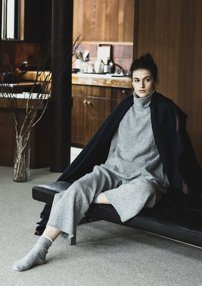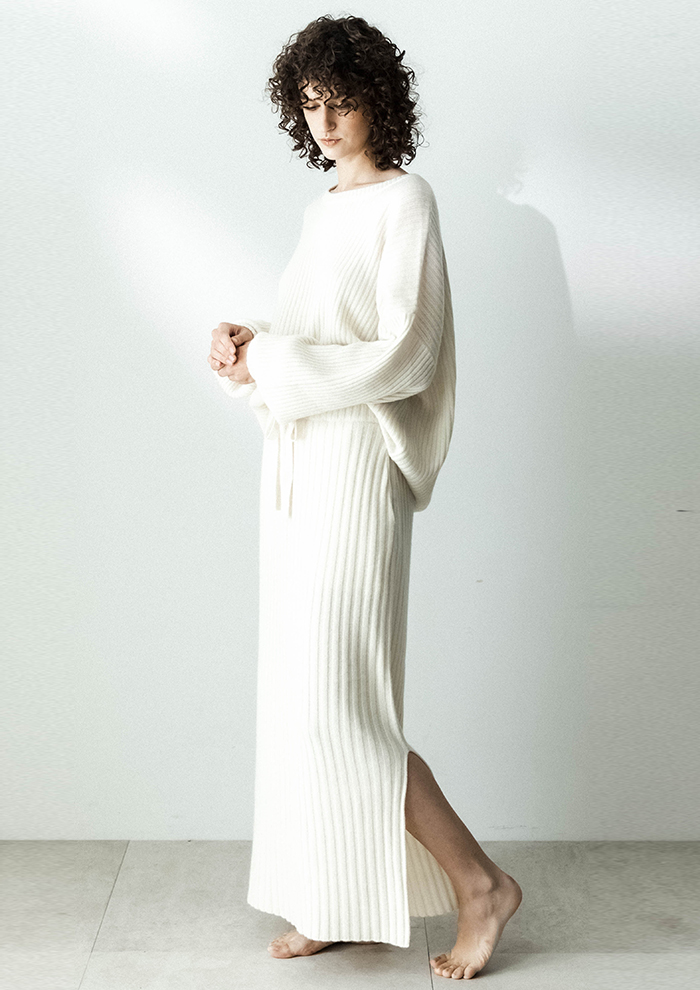 「まずご紹介するのは、オン・オフで着まわせるリブクルーネック。オーガニック認証を受けた牧場で育ったカシミヤ山羊から採取した細番手のオーガニックカシミヤを贅沢に使用し、ゆったりとしたシルエットのプルオーバーに仕上げました。同素材のスカートとセットアップで着るのもおすすめ。スカートもリブデザインにし、すっきりとしたロング丈が縦のラインを強調します。裾のスリットが女性らしいポイント。どちらも単品でも使い勝手がよく、手軽にやわらかな雰囲気をまとえます」。