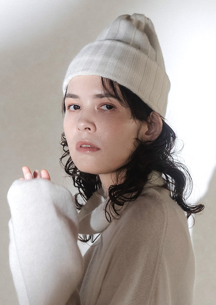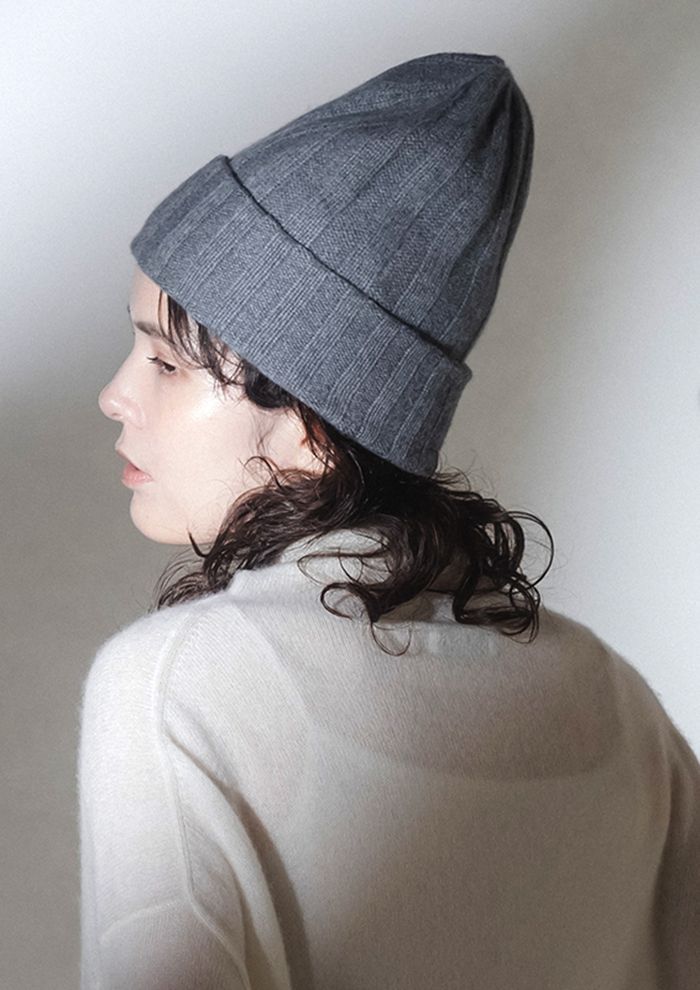 「生後1年未満のカシミヤヤギから採取したベビーカシミヤは、繊維の細さが一般のカシミヤの15.5~17㎛に比べて、14㎛という極細繊維です。この希少な繊維を縫い代の無いホールガーメント機でていねいに何本もより合わせて編み上げ、ニットキャップに仕上げました。ベビーカシミヤでしか表現することのできないやわらかな肌触りは、いつもの着こなしに上質なアクセントを加えます」。