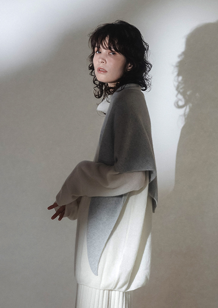 「こちらも希少な極細ベビーカシミヤを用い、縫い代の無いホールガーメント機で編み上げたトライアングルストール。空気を含んだようなつけ心地と、巻いたり、羽織ったりといった多彩なアレンジ力で、スタイルの主力となってくれます」。