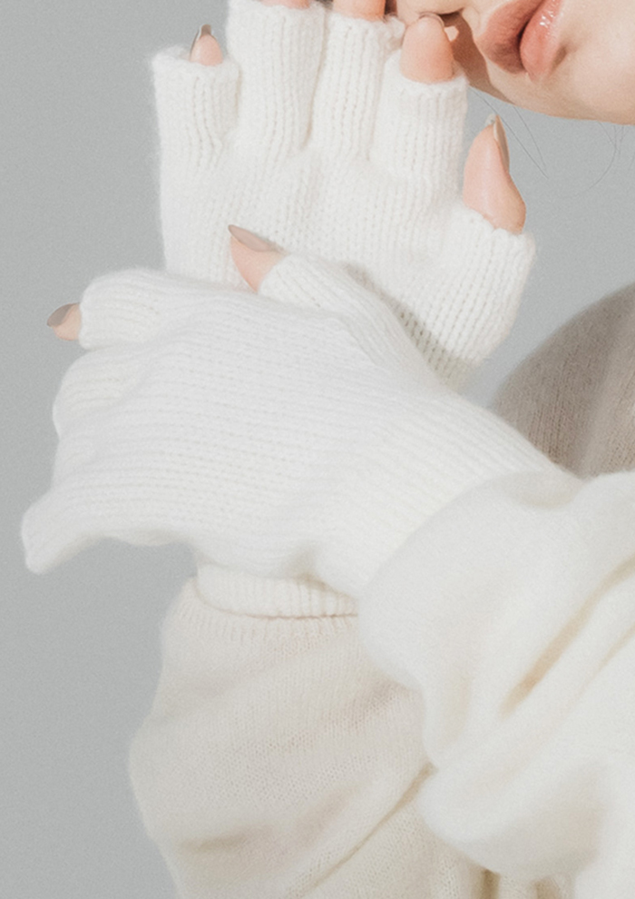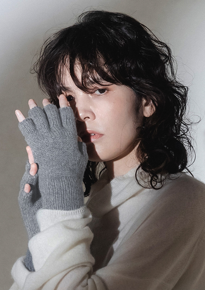 「こちらも上記と同じベビーカシミヤを無縫製のホールガーメント機で編み上げたニットグローブ。縫い代の無いフィンガーレス仕様のため、スマホ操作も快適! 極上のつけ心地で、着こなしのアクセントになります」。