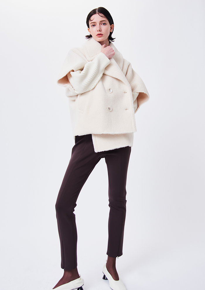 「まずは、オーバーシルエットのポンチョにストールがついたデザイン性の高いコートからご紹介。ストールの巻き方によって多様な着こなしが楽しめ、ラグジュアリーな雰囲気をまとえます。ナチュラルなストレッチ性がある、ジャージのような布帛のリバー素材を使用。ほどよい膨らみ感とハリ感が高級感を感じさせます。ほどよい丈は、デイリー使いにぴったり」。
