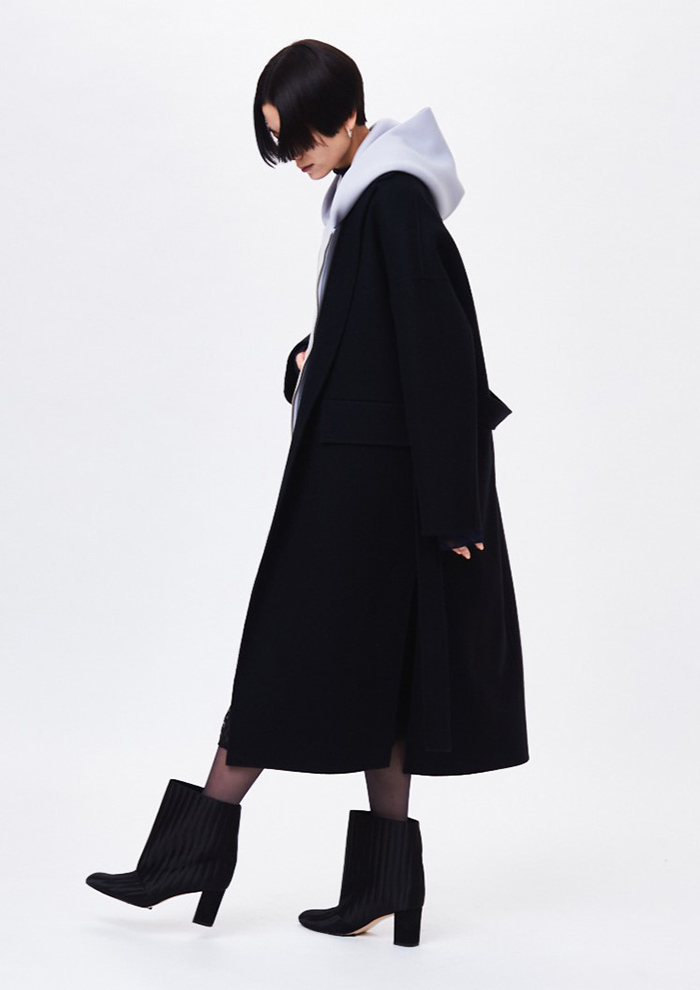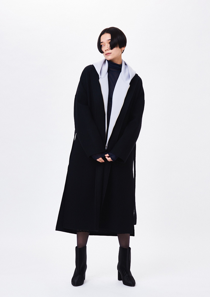 「ウールを100%使用した、オーバーサイズでも全身をすっきりと見せてくれるテーラーリバーコート。仕立てにこだわり、たっぷりとした分量感がハンサムな雰囲気を演出します。やわらかな肌触りと素材感がすっと体になじみ、ロングコートとは思えないくらい軽やかな着心地を実現。シャープな襟や、余計なディテールが無いミニマルなデザインのため、さまざまなスタイルに着まわしが可能です」。