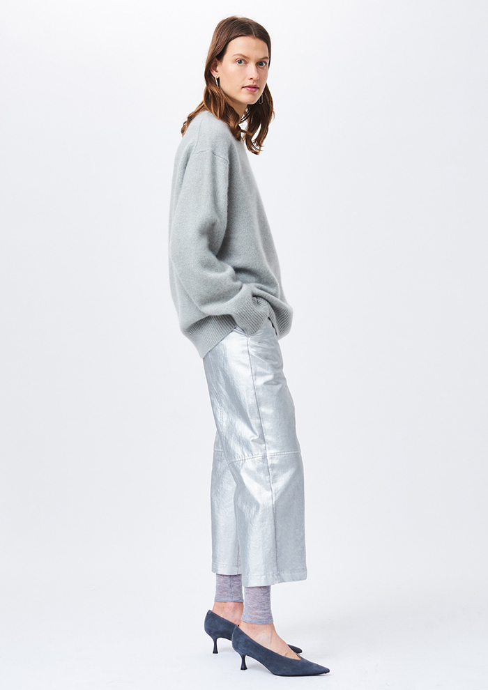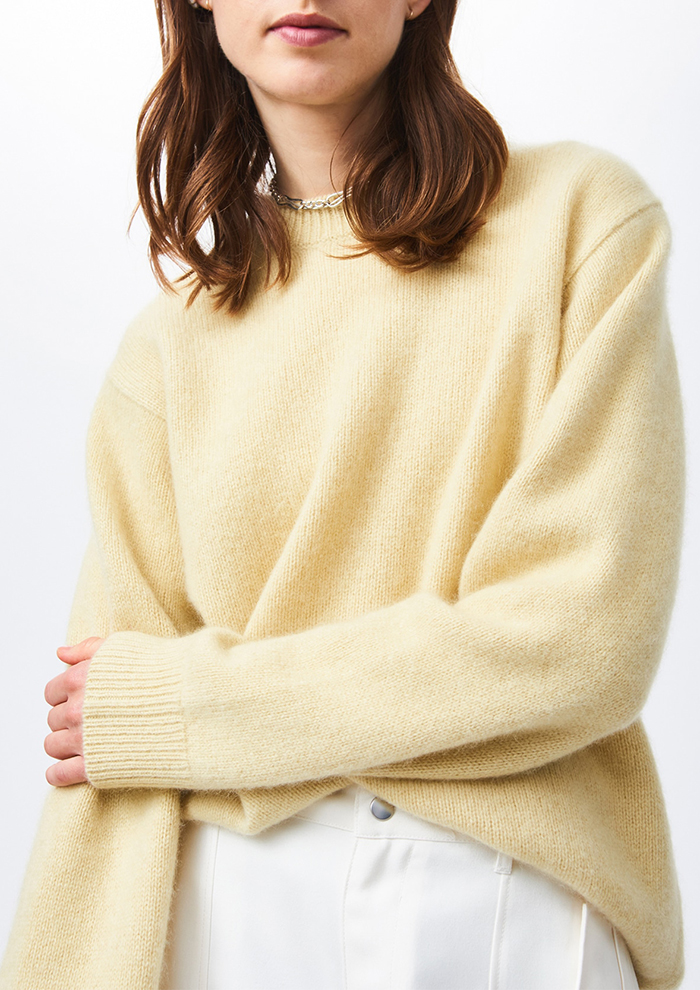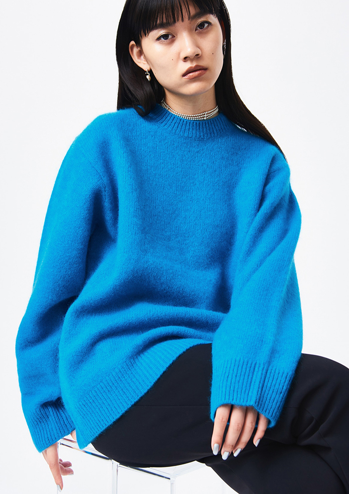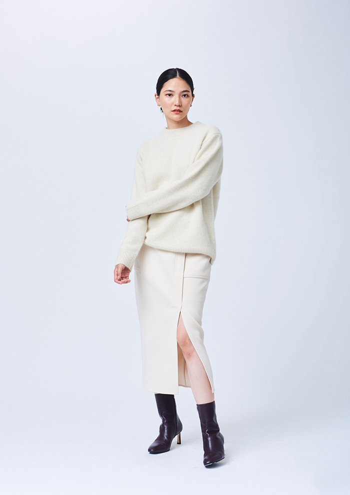 「ブランド内で累計10,000枚以上の売上を誇るホワイトヤクプルオーバーも要チェック。しなやかかつやわらかい極上の着心地で、豊富なカラー展開も魅力です。素材は、一般的なブラウンのヤクではできなかった発色の良い色展開を可能にした“ホワイトヤク”。標高3,000メートル以上の高地に生息する“ヤク”の毛は軽量で、保温性や防寒性に大変優れており、弾力性が高く摩擦にも強い性質があり、シワや毛玉になりにくいのも特徴です。そのふんわりとした女性らしい風合いをあえてメンズライクなシルエットに落とし込み、サイズをS、M、Lから選べるようにしました。シンプルなため、カジュアルからレディライクなスタイリングにまでマッチします」。