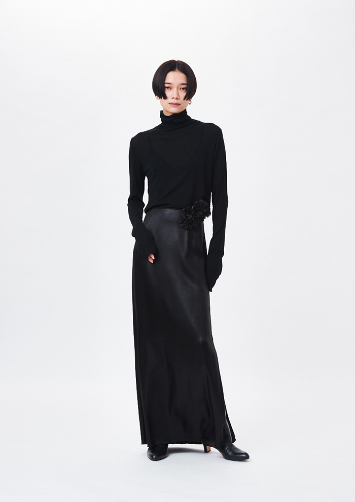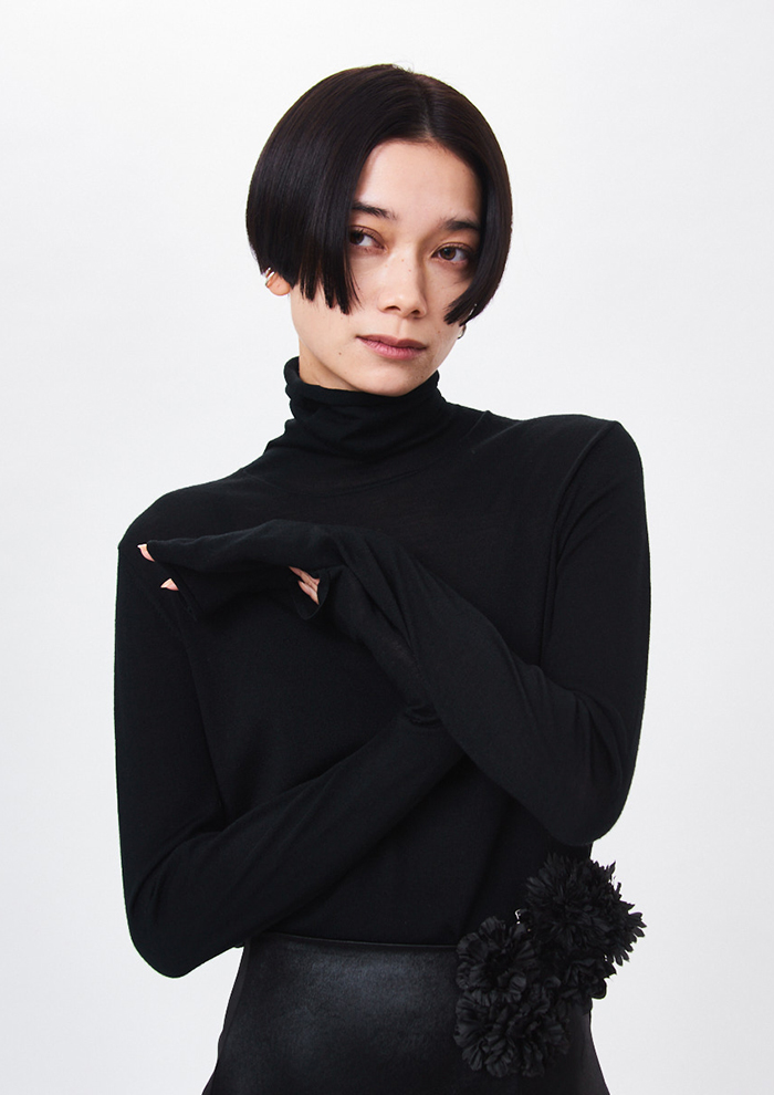 「上質なウールシルクを超ハイゲージで編んだワンランク上のタートルネックニット。数少ない特別な機械で時間をかけてゆっくり編み上げることで、目の詰まった繊細で上品な透け方に仕上がりました。ネックはぴたっとしすぎないほどよいフィット感。ストレスフリーな着心地ですが、上品な印象で着こなせます。ご自宅で手洗いできるのもポイント」。