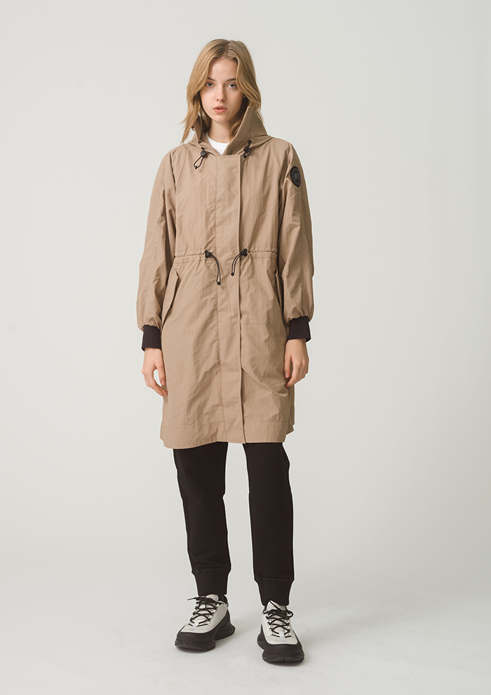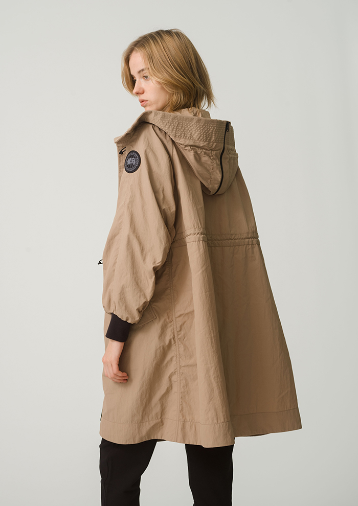 「スプリングコレクションから待望の新作ジャパンエクスクルーシブモデルが登場。保護力のある膝丈を採用し、すっきりとしたウエストとスプリットタイプのフードを特徴としています。フードに付いたジッパーを開けると、肩まわりにボリューム感が出て、より華やかな印象に。袖口は伸縮性のあるリブ仕様なので、風を通しにくく、シルエットにメリハリが出てバランスも取りやすいです。カジュアルでもきれい目でもコーディネートを選ばず、デイリーに大活躍!」