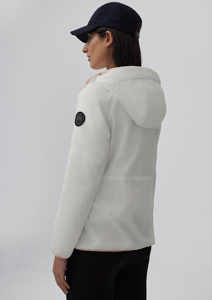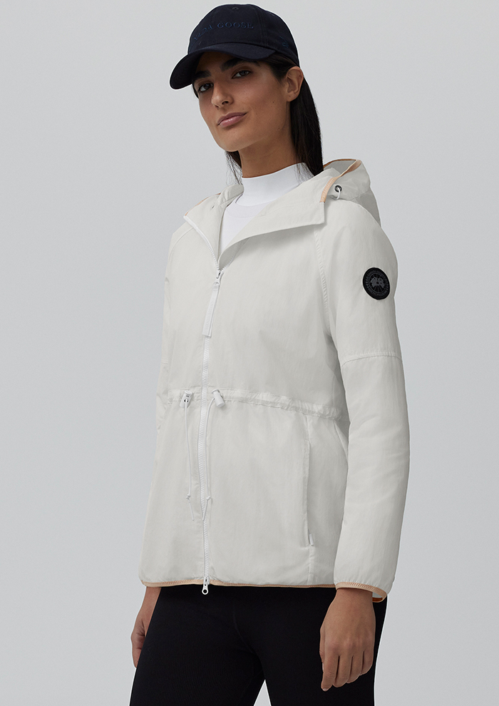 「防風性と耐久性に優れたファブリックを採用した“ランデル ジャケット”。フロントのダブルジップを調整しドローコードでウエストを絞るだけで、簡単にこなれたシルエットが完成します。内側にはメッシュのベンチレーションを備えており、温度調節も自由自在。羽織るだけで明るく洗練された印象に見せてくれるホワイトのジャケットは、オフィスでもプライベートでも幅広いシーンで活躍し、同じトーンのアイテムを組み合わせるとよりフレッシュで女性らしいスタイリングに仕上がります。ディスクが黒のブラックレーベルです」。