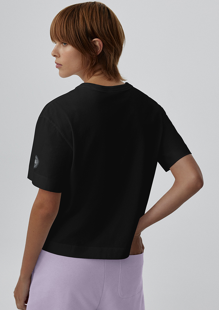 「今までエル・ショップでは展開のなかったTシャツが今シーズン仲間入り。新たなワードローブの必需品として登場したこの“ブロードビュー ボクシー Tシャツ”は、クロップド丈のクルーネックにリブニットの襟が特徴。素肌に触れるような上質な手触りのコットン100%を使用し、優れた通気性と機能性を備えています。ハイウエストのロングスカートやボトムと合わせると、ウエスト位置が高く見えてスタイルアップ効果も◎」。