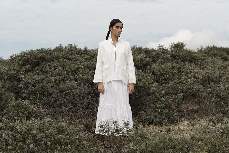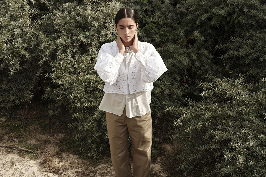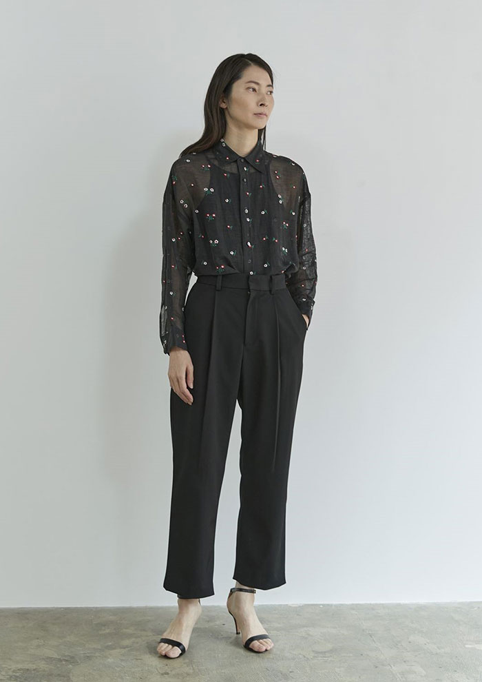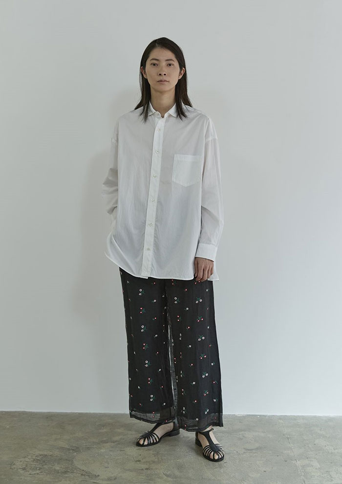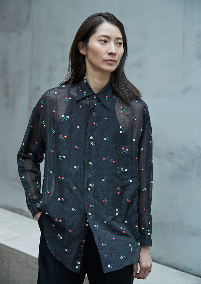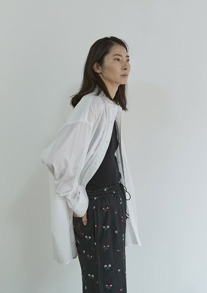 「可憐な小花刺しゅうのシャツは、極薄リネンが空気を含んだようになめらかなシルエットを描き、上半身を華奢に見せてくれます。シャツとしてはもちろん、羽織としても活躍。ルックではシンプルながら色気と存在感のあるマニッシュなサイドラインパンツをスタイリング。カジュアルシーンでもジャケットと合わせればオケージョンアイテムに昇華」。