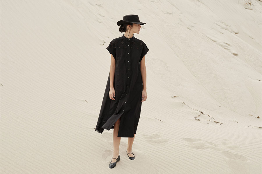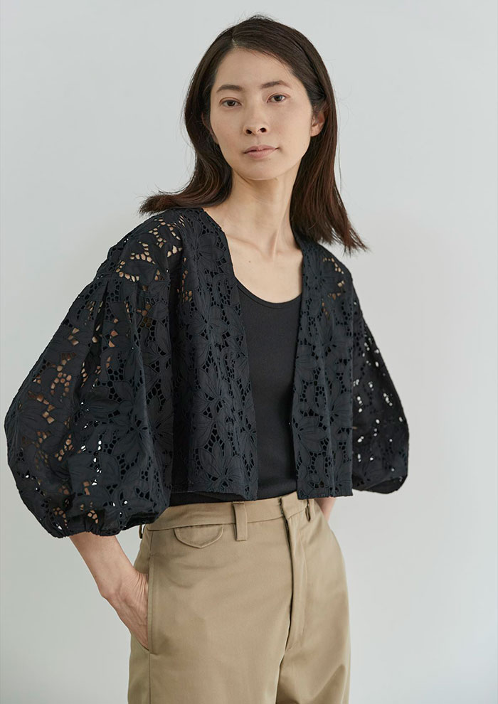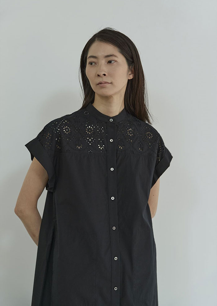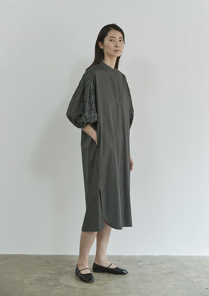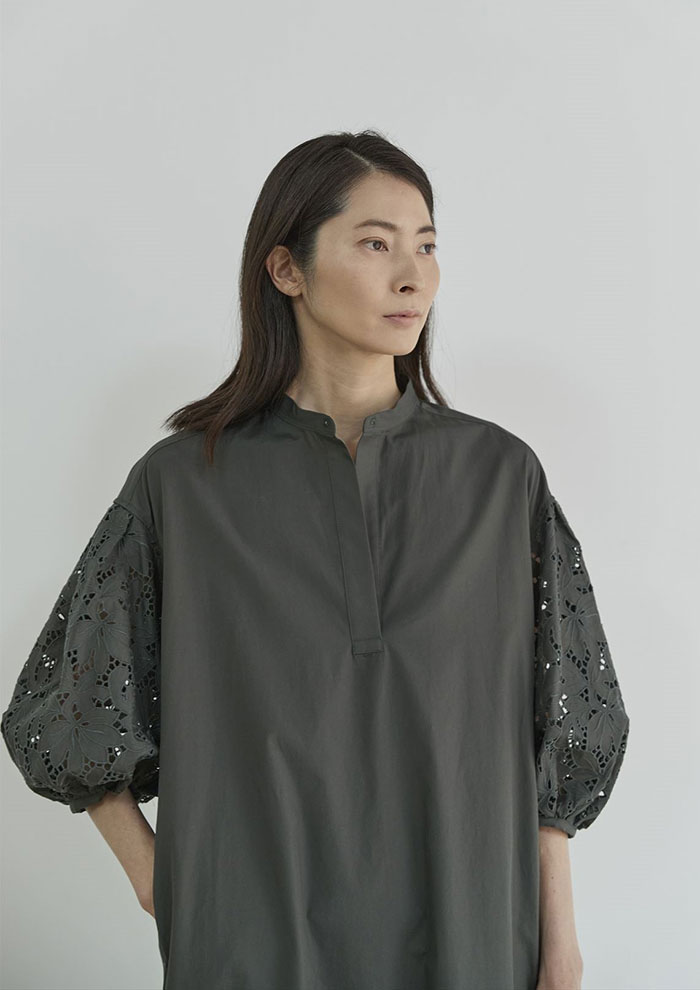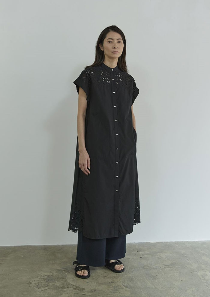 「人気のレースシリーズに凛々しくてフェミニンなワンピースが登場。甘すぎないエンブロイダリーレースできちんと感を出した一着です。存在感たっぷりなワンピースですが、ボトムにワイドパンツなどを合わせたレイヤードスタイルもおすすめ。旅先やきちんとした場所でもシーンを問わず着こなせます」。