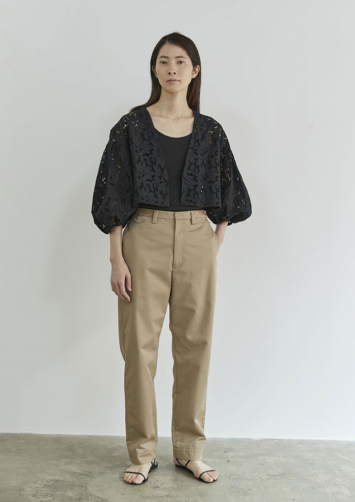 「サンタフェのムードを感じさせる異国の大花や植物をモチーフにした大胆な柄のレースでジャケットを製作。一枚でも存在感のあるこのジャケットは、シンプルなボトムと合わせるだけで洗練された着こなしに。ルックでは、人気のバナナチノパンツをさらにすっきりとクリーンにリニューアルしたパンツをスタイリング。絶妙なカーヴィラインの美シルエットが特徴です。アメリカンカジュアルの雰囲気を持ちながら、上品な光沢と軽くて気持ちの良い肌触りに加え、丈夫でシワになりにくい優れた機能性も魅力」。