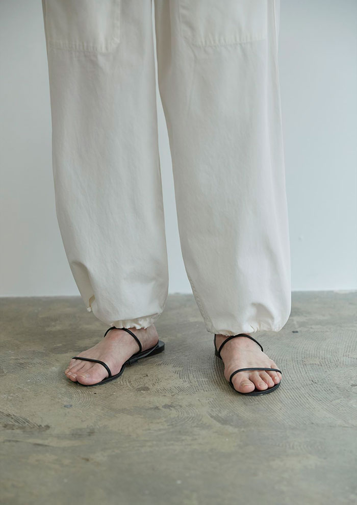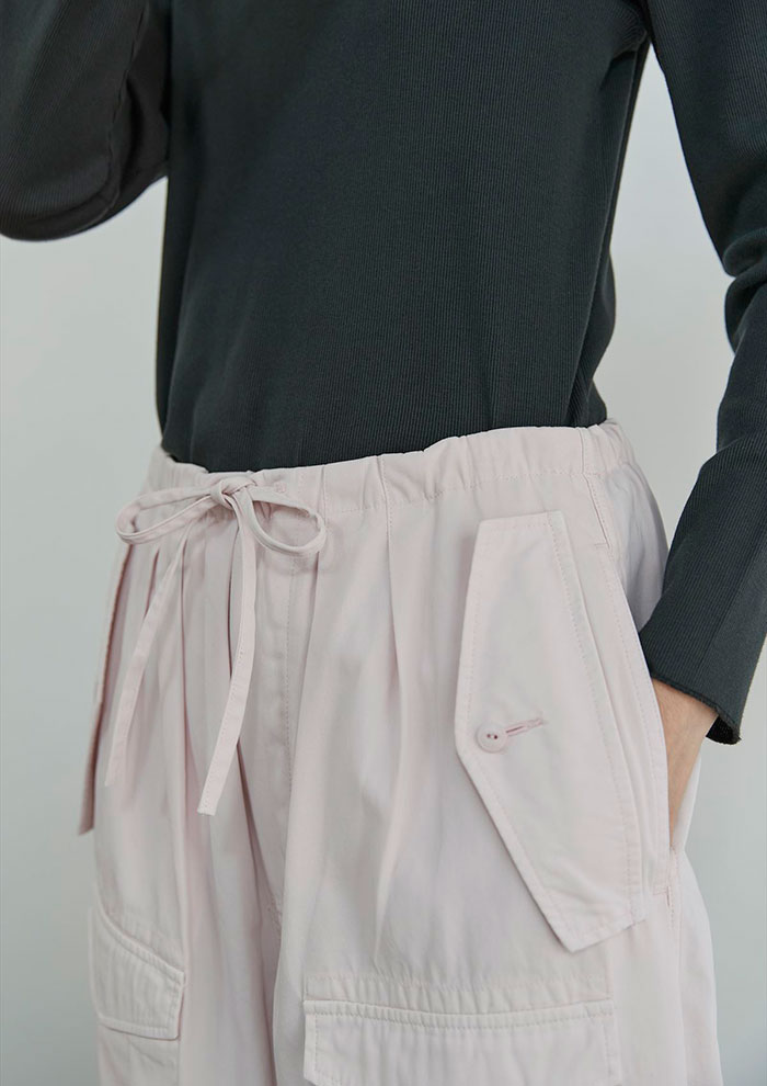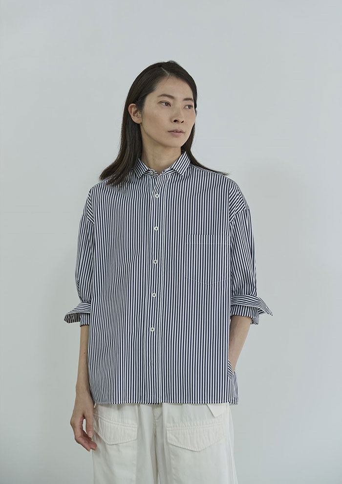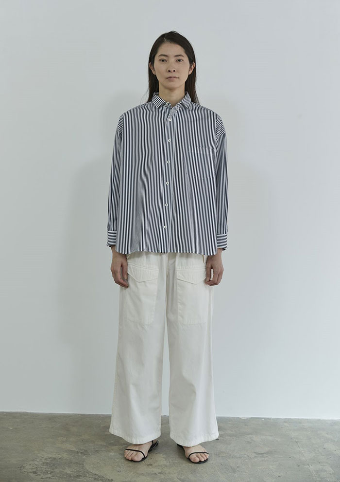 「「ティッカ」のブランドデビューからずっと素材や着丈を変えながらつくり続けている名品シャツ。着る人の年齢を問わず、体型も気にすることなく着られる上品な一枚です。ルックで合わせたのは、パステルカラーが新登場したシックなカーゴパンツ。ワイドな裾でエレガントに、裾を絞るとややシャープな印象に。大人のカジュアルからモードな着こなしまで多様に楽しめます」。